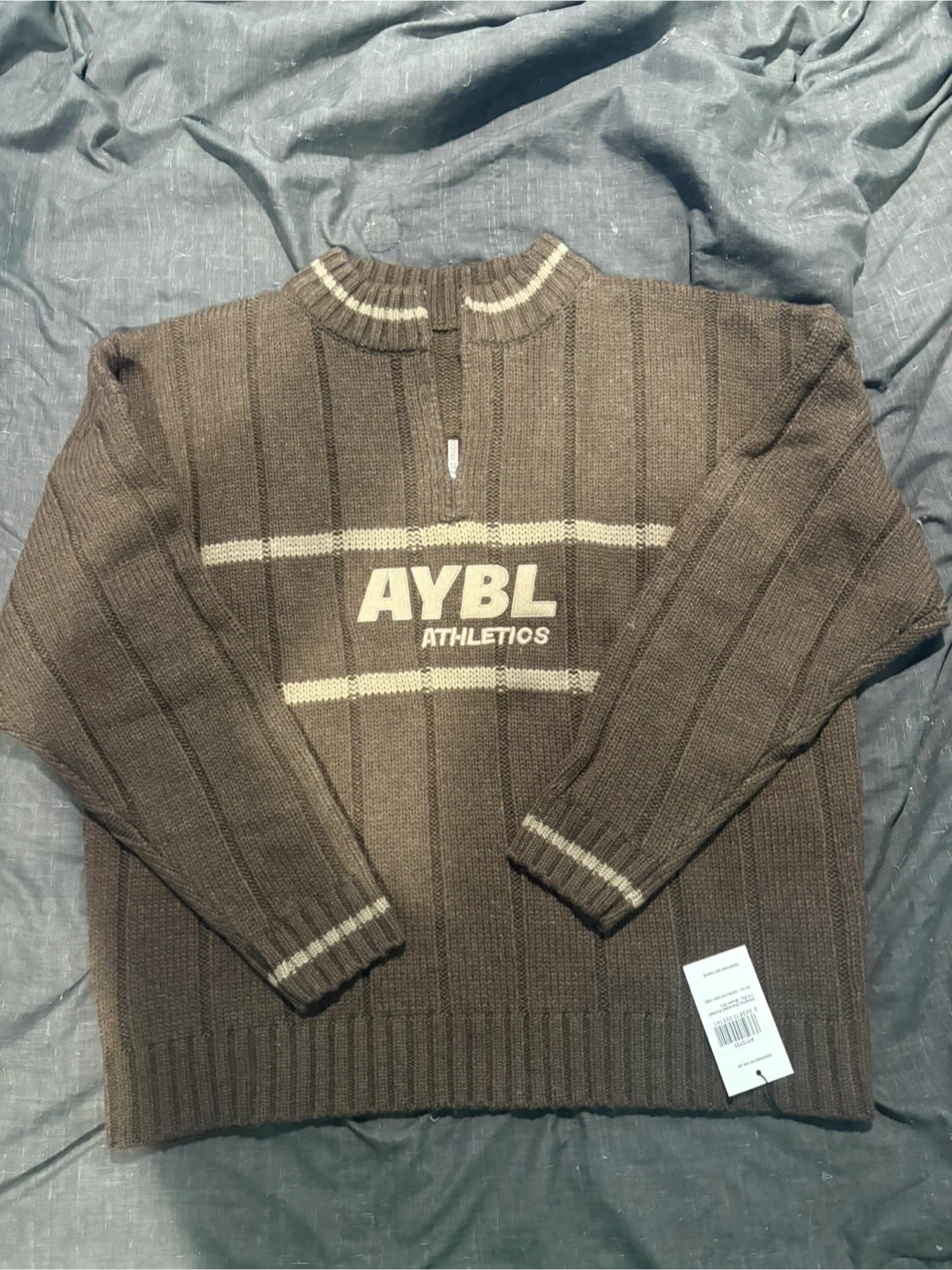 AYBL Athletics quarter zip sweater. Brown knit material with beige stripes and logo. It's a comfortable sweater for everyday wear. Non smoking home, brand new with tags still on. Oversized so can fit up to XL if you want a fitted style. Original price is $80.