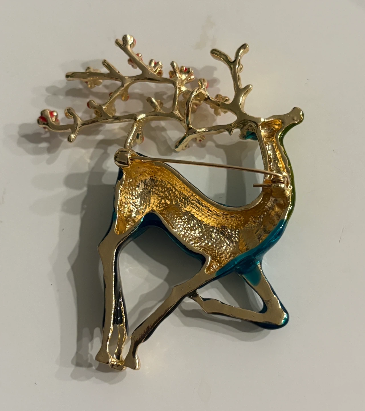 Beautiful Gold & Teal Reindeer Brooch with Red Flowers