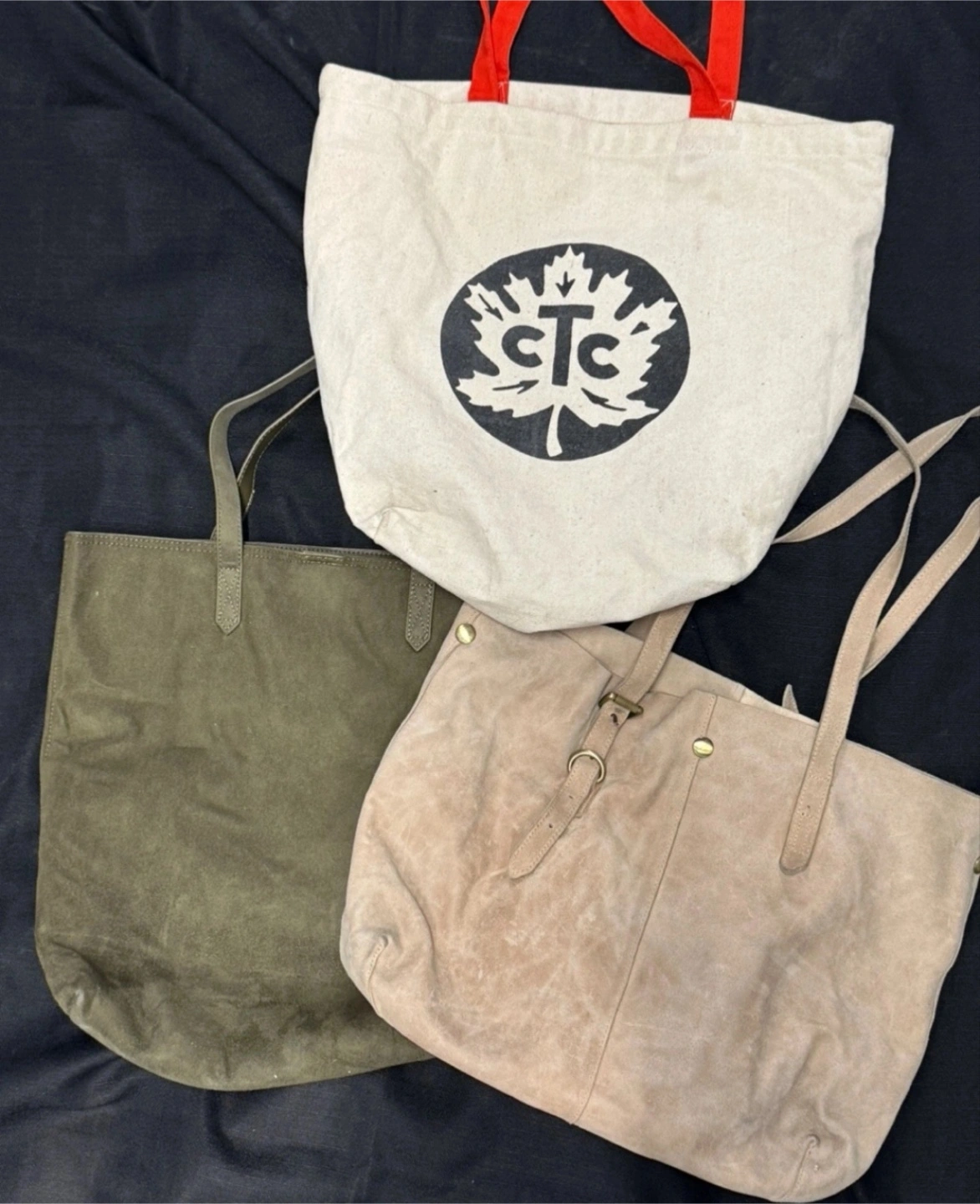 2 super spacious tote bags for $5, plus a free Canadian Tire canvas shopping tote. All three are great for everyday use and can carry a laptop, notebook + others. Minor imperfections on both as pictured but doesn’t affect the functionality. A bit of peeling on the straps of the green tote and some discolouration on the pink.