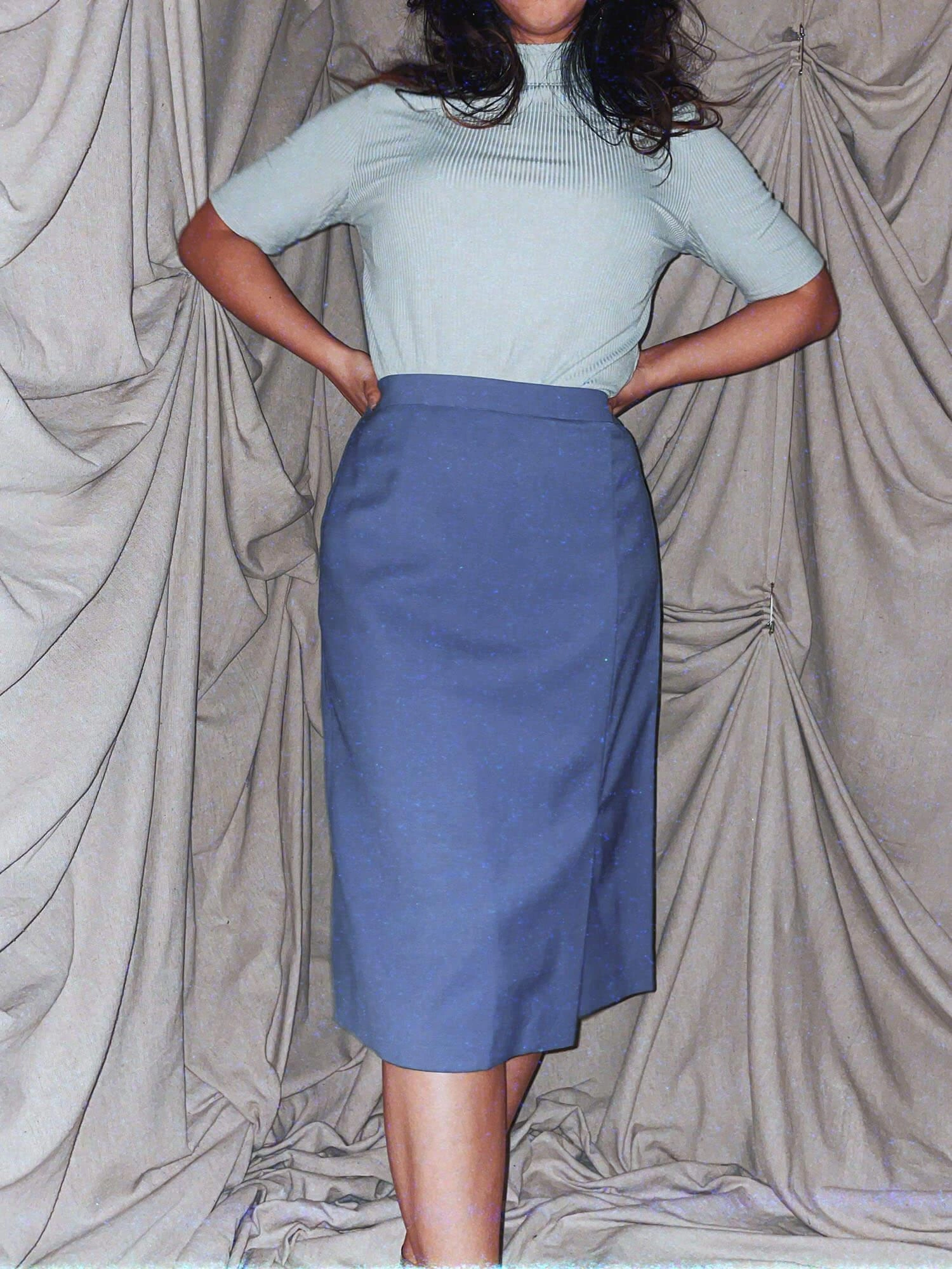 vintage cornflower blue midi high waist office skirt