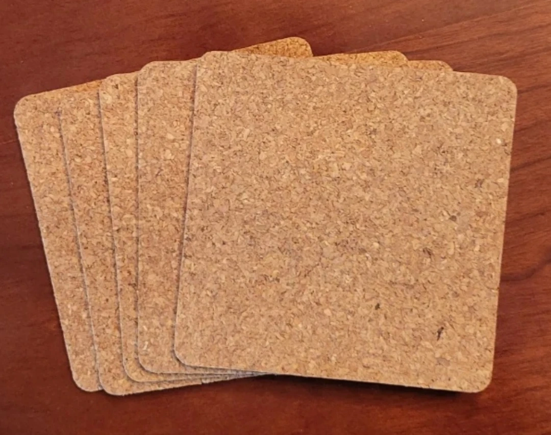 Set of five square cork coasters. Cork material helps protect surfaces from moisture and heat. Useful for preventing rings from drinks.