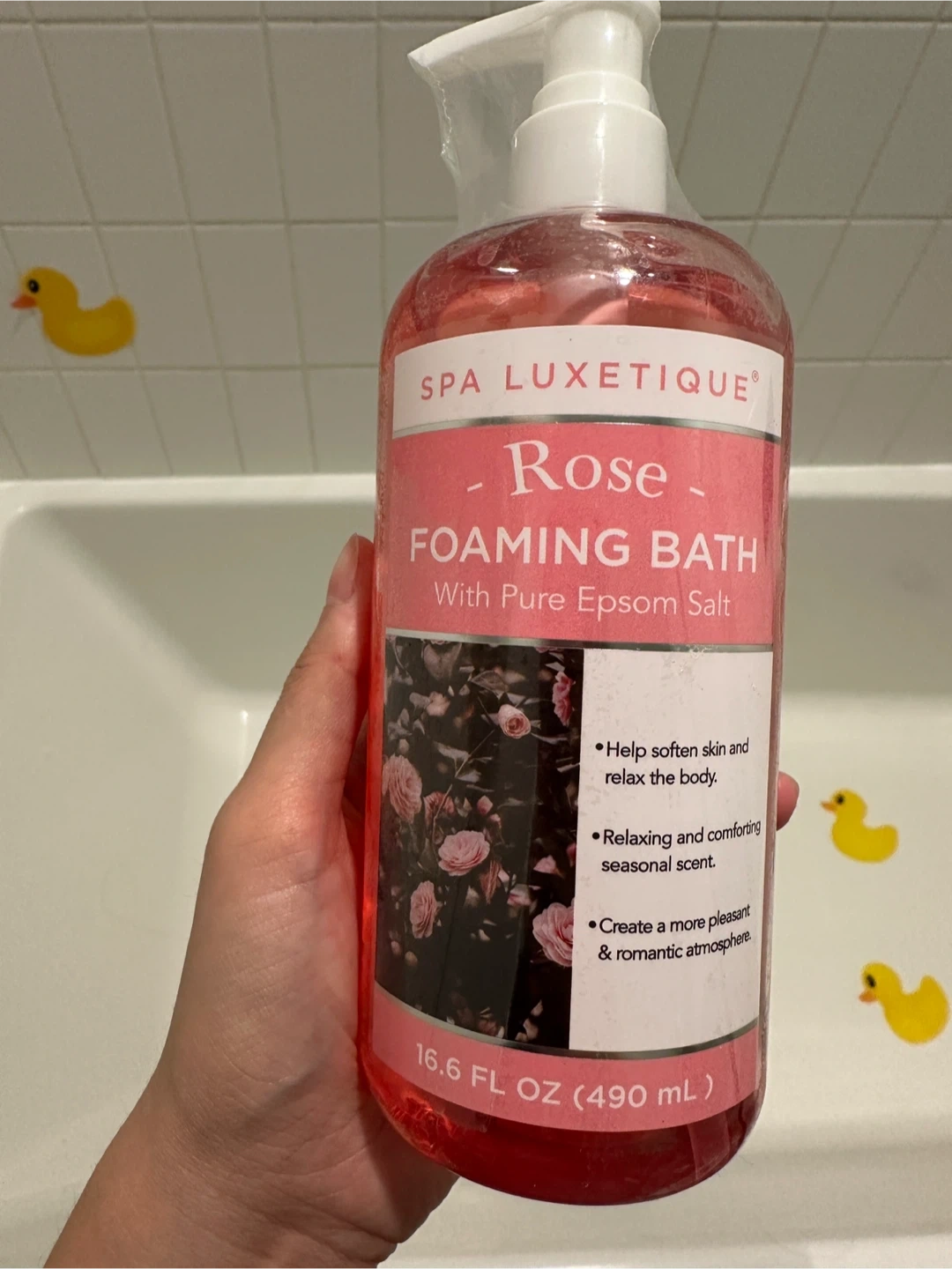 Spa Luxetique Rose Foaming Bath with Pure Epsom Salt. It softens skin and relaxes the body. This foaming bath has a relaxing and comforting rose scent. Comes in a 16.6 fl oz (490 mL) bottle.