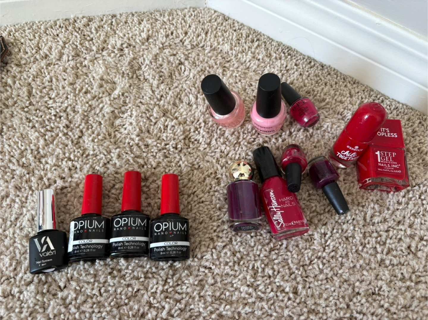 This lot includes several nail polish bottles in various shades of red and pink. Brands include Opium, Essence, and Valori. Most bottles contain a good amount of product left.