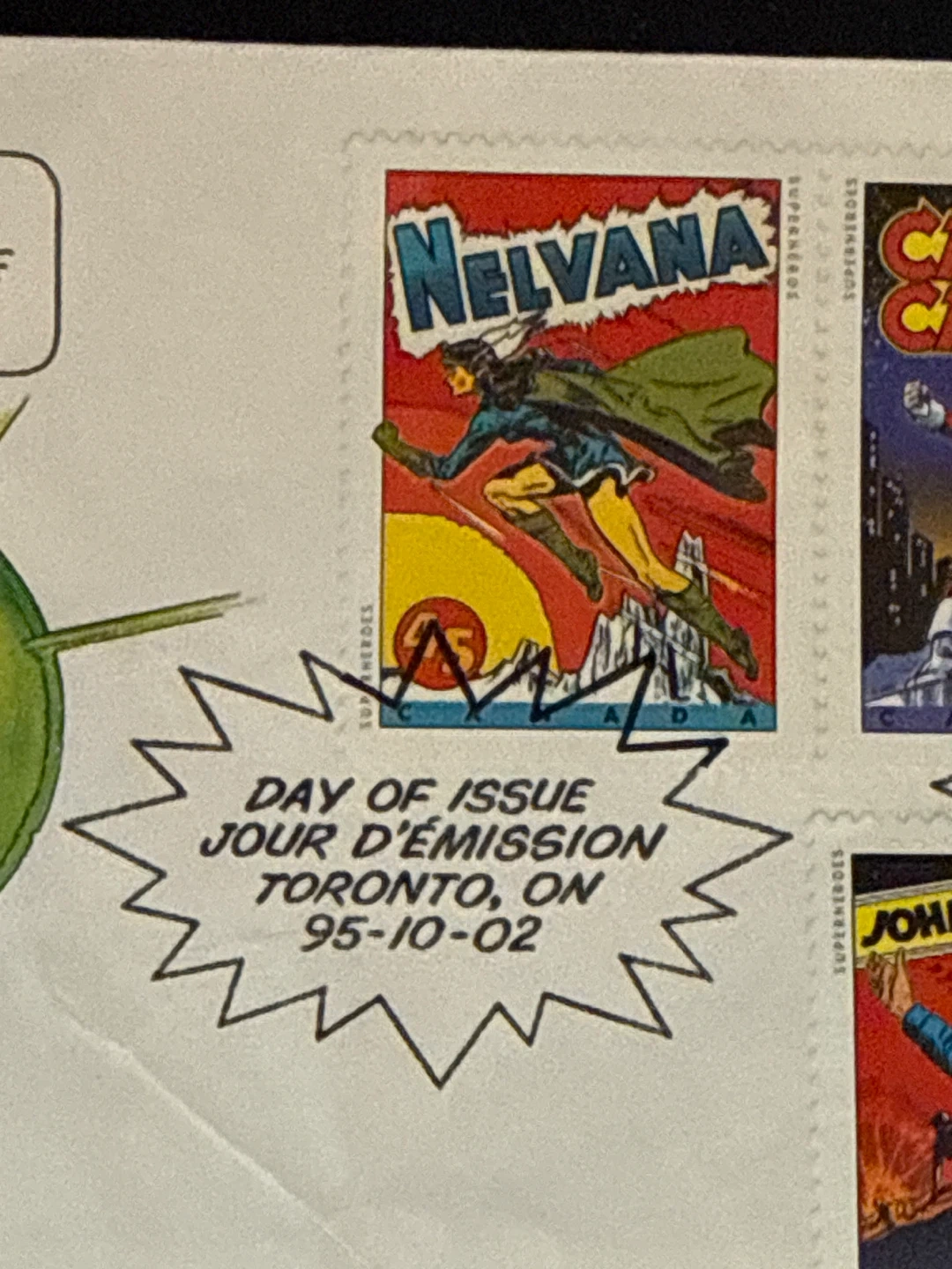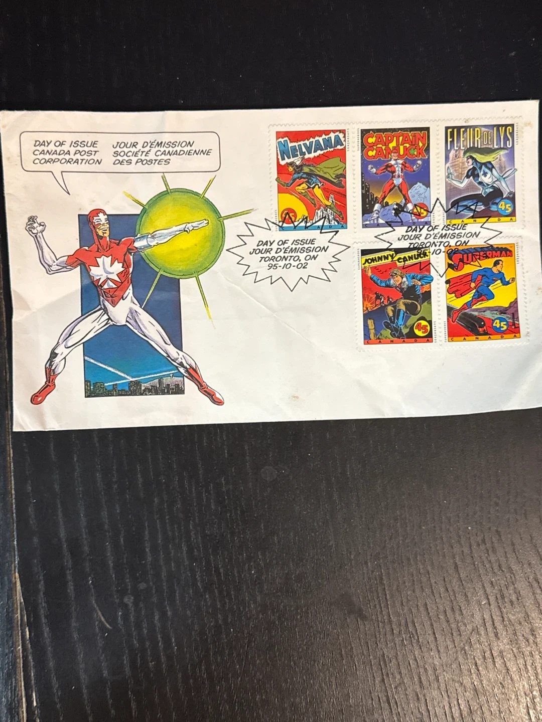 This is a Canada Post Day of Issue stamp sheet from Toronto, ON, dated 95-10-02. It features Canadian superheroes Nelvana, Captain Canuck, Fleur de Lys, and Johnny Canuck, along with Superman. The sheet showcases collectible Canadian comic book heroes.