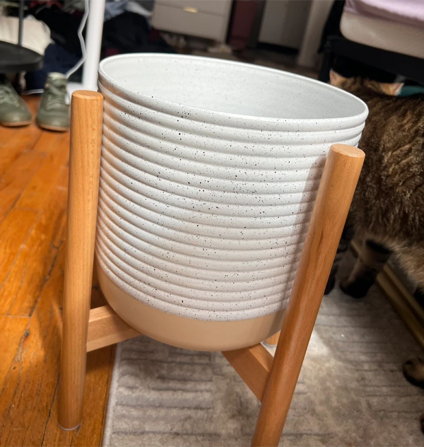 White speckled planter with a light brown base. It's supported by a natural wood stand. This planter's dimensions are approximately 10 inches tall and 9 inches in diameter. It's perfect for adding a touch of green to your living space!