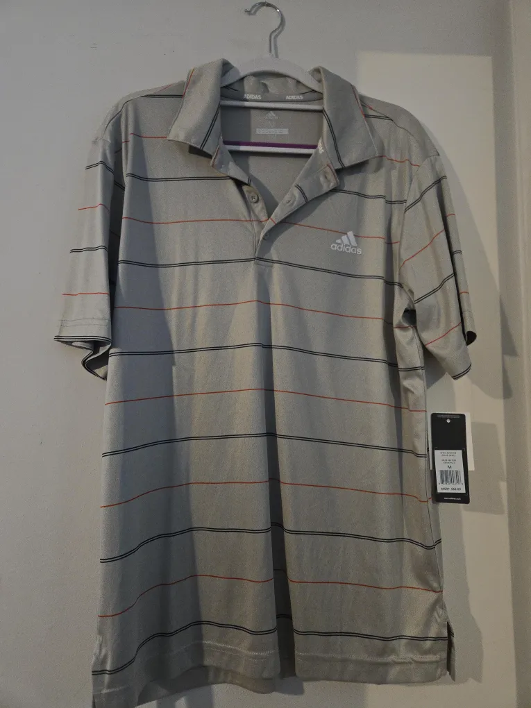 This is an Adidas men's polo shirt. It's a size medium with a gray base and red and black stripes. The shirt's material appears to be a performance fabric, ideal for active wear.