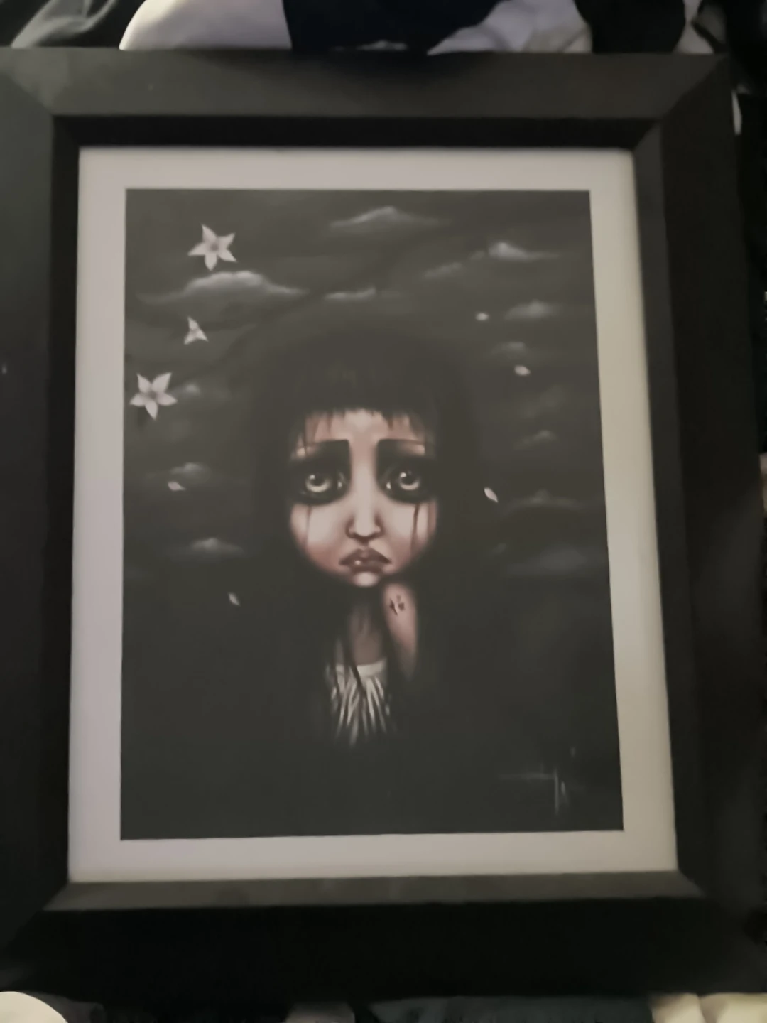 A framed art print featuring a dark, moody portrait of a doll-like figure with large eyes against a cloudy background. Includes white matting and a black frame. It's ready to hang!