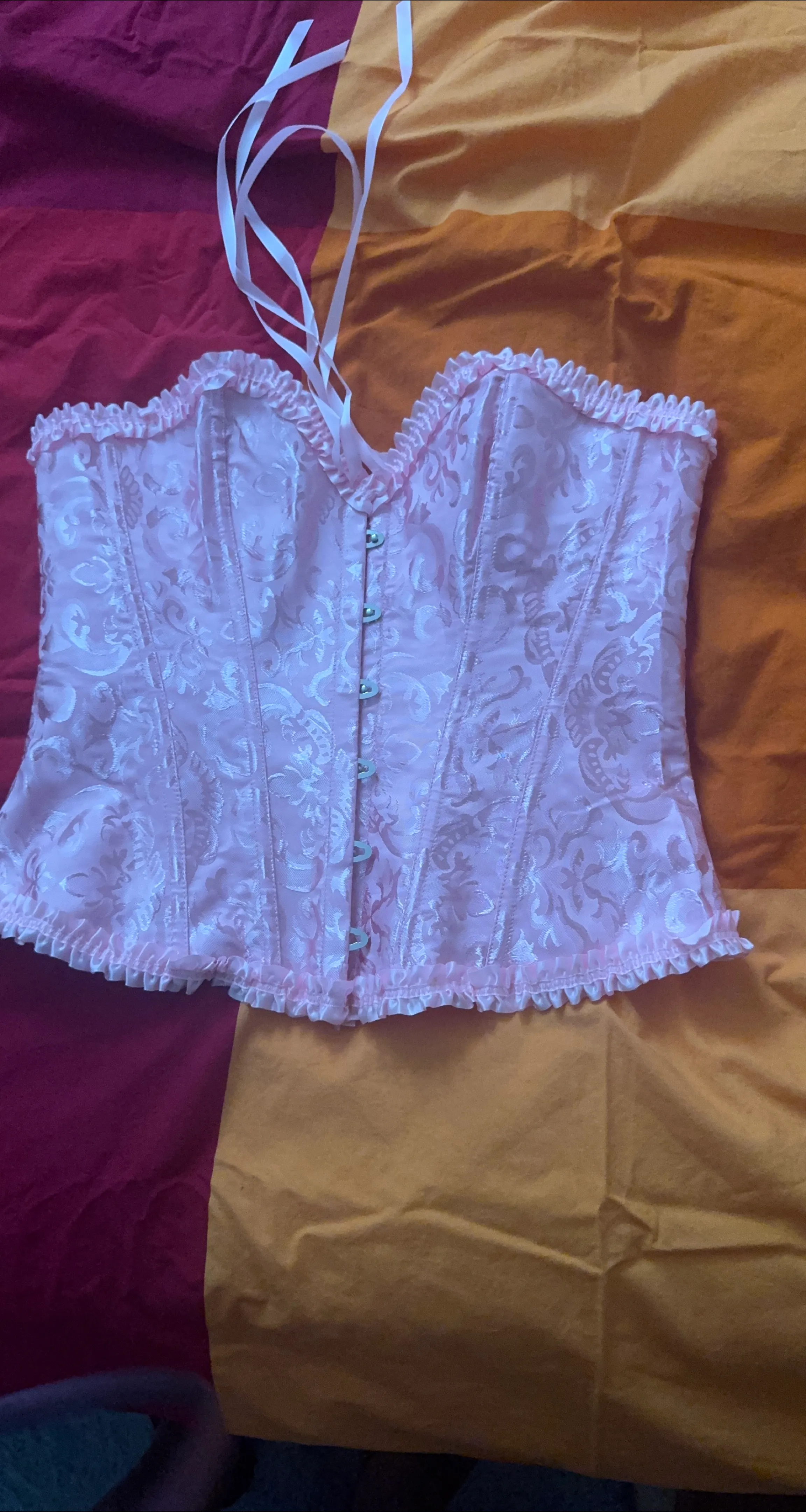 Pink corset with delicate pattern. Features ruffled edges, and a ribbon tie. This would be the perfect addition to your wardrobe for a night out, or even for a special occasion.