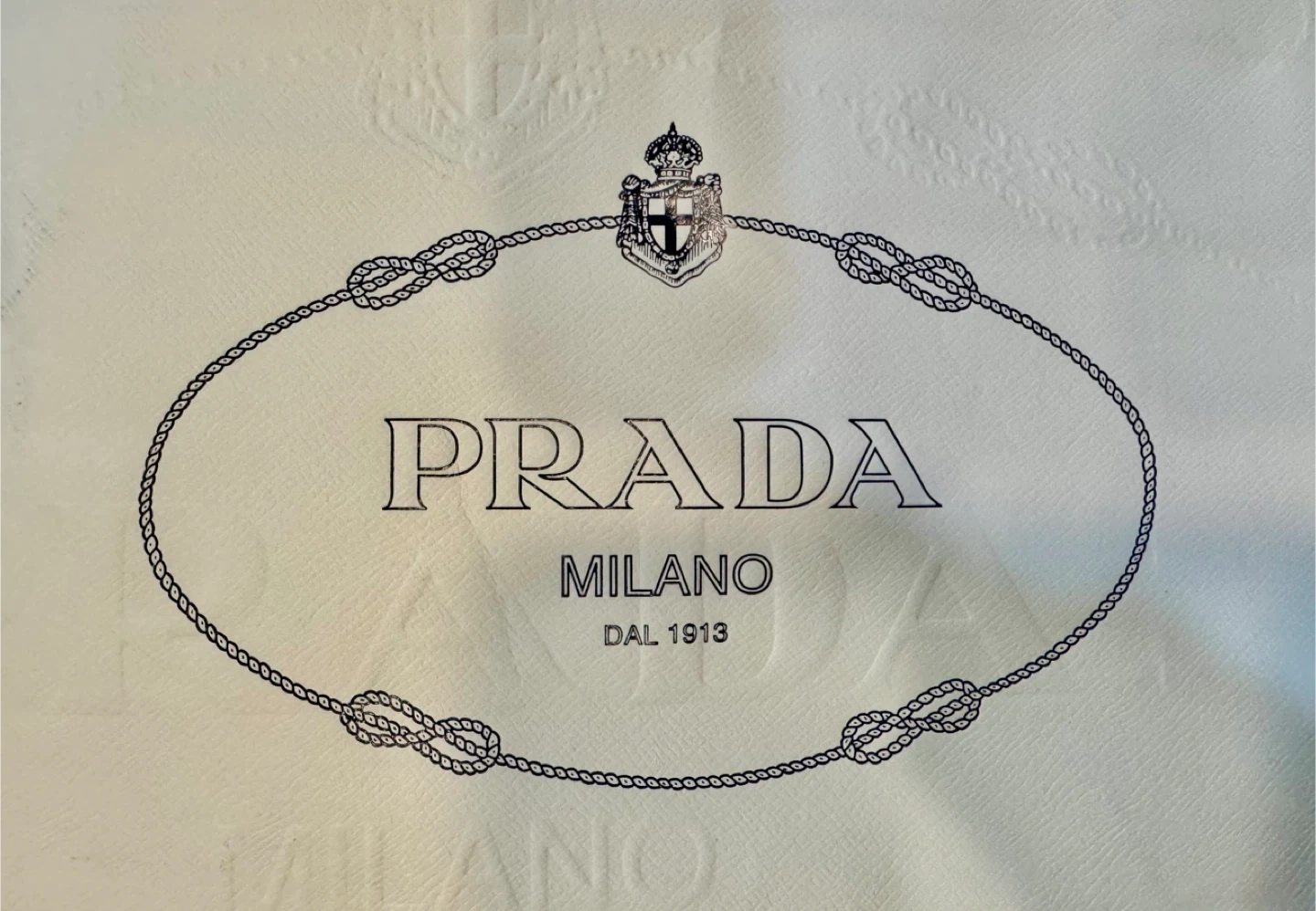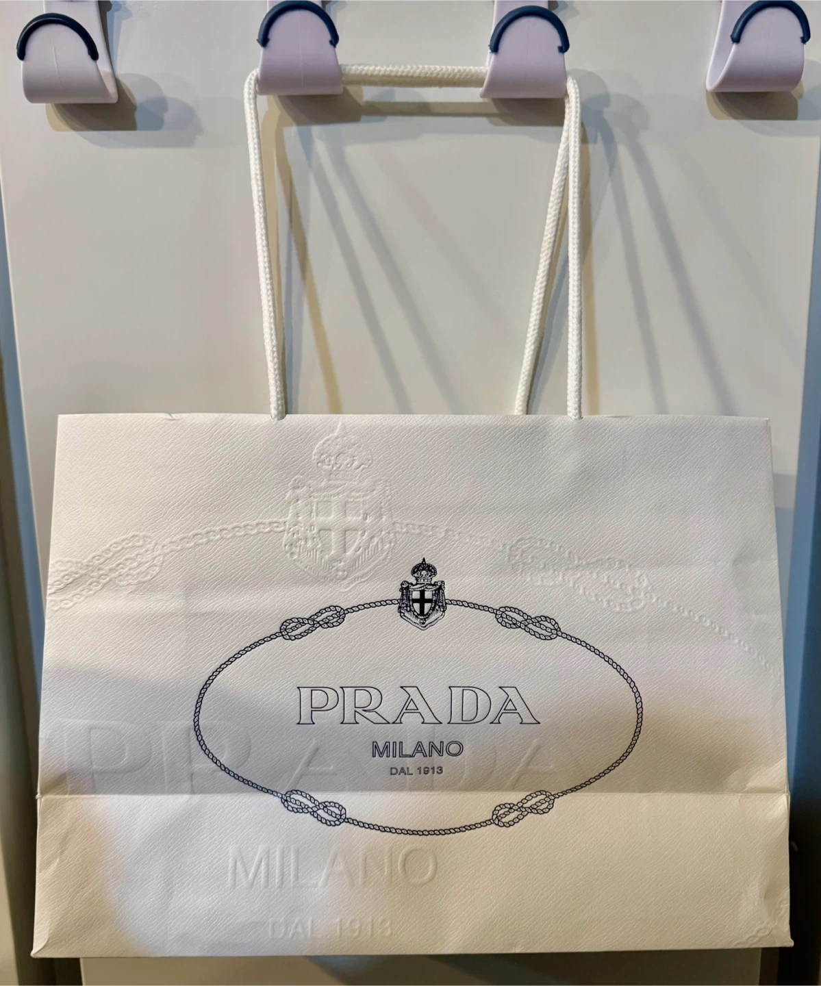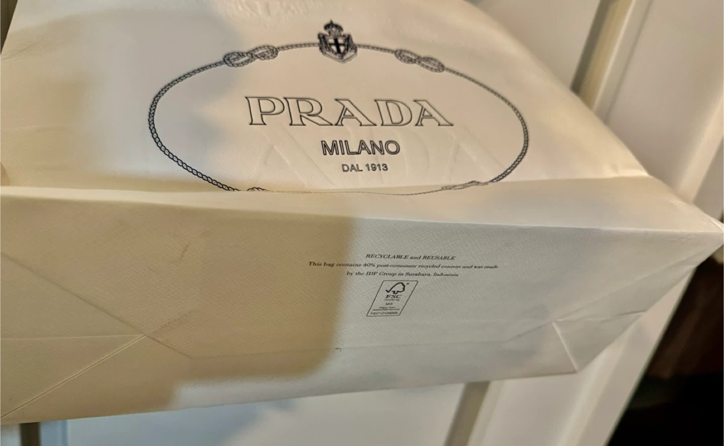 White paper shopping bag from Prada. Features the iconic Prada logo and rope handles. This bag is recyclable and reusable, made with 80% post-consumer recycled content.