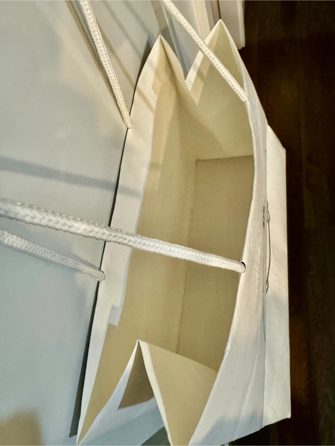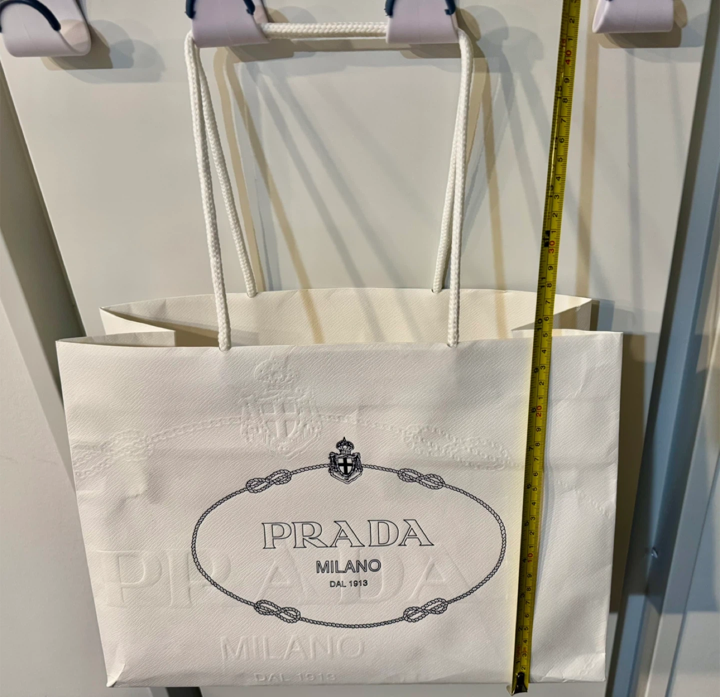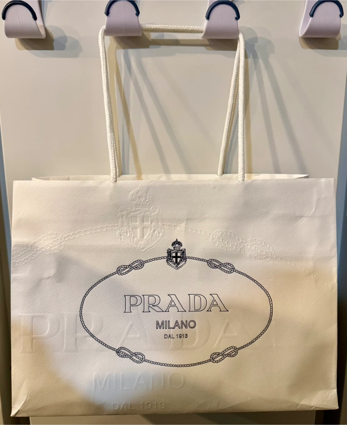 White paper shopping bag from Prada. Features the iconic Prada logo and rope handles. This bag is recyclable and reusable, made with 80% post-consumer recycled content.