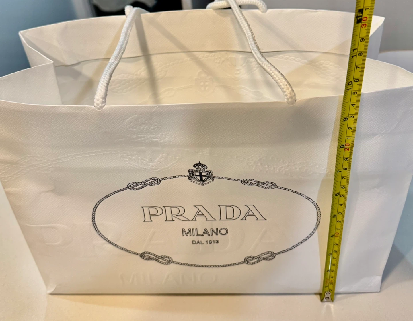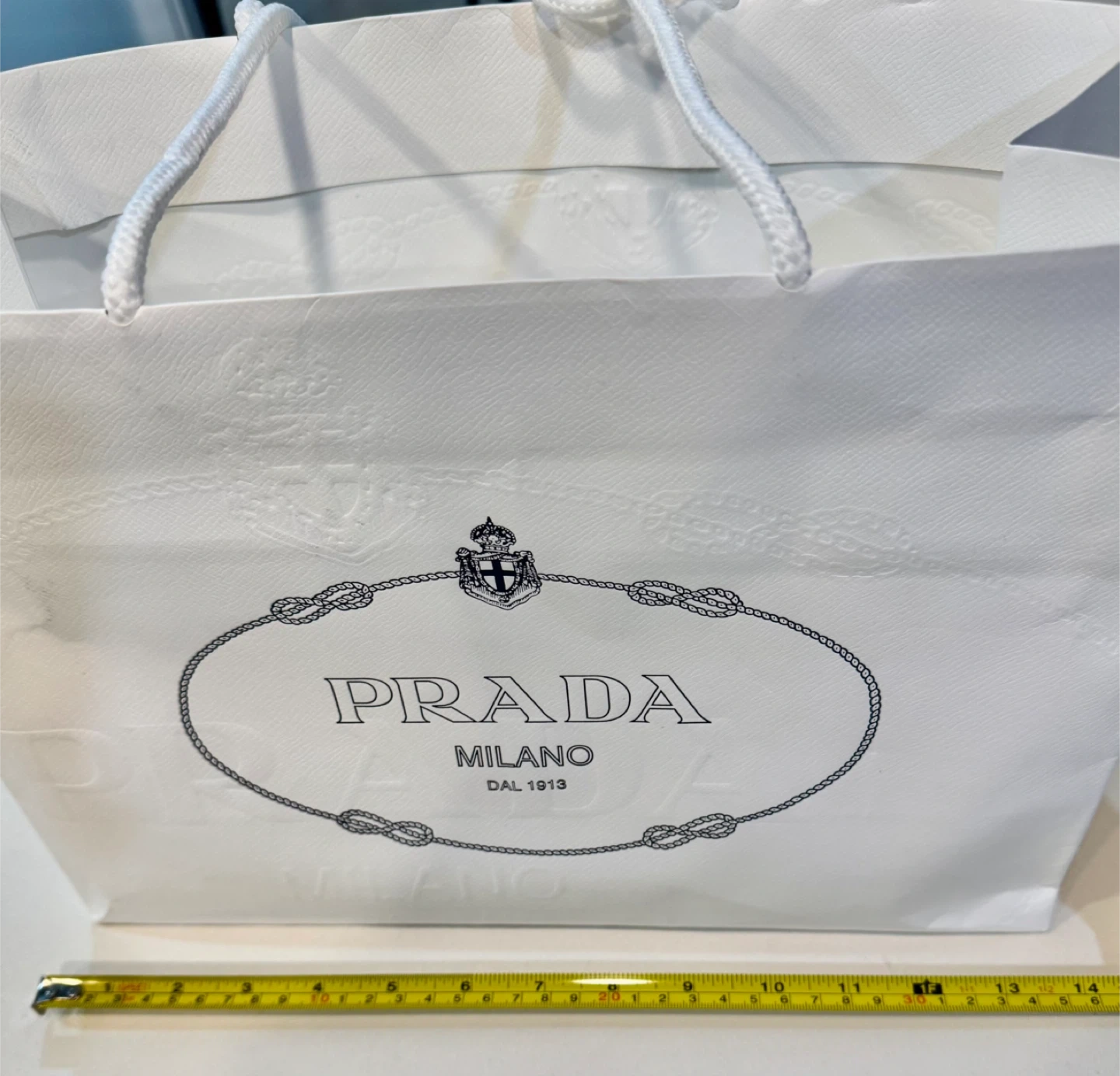 White paper shopping bag from Prada. Features the iconic Prada logo and rope handles. This bag is recyclable and reusable, made with 80% post-consumer recycled content.