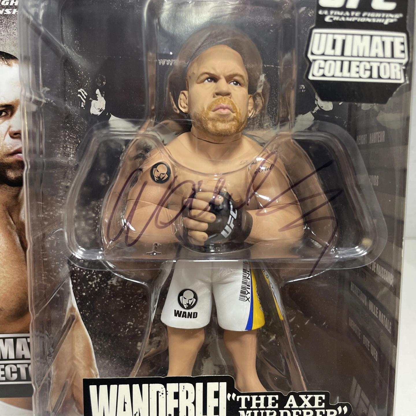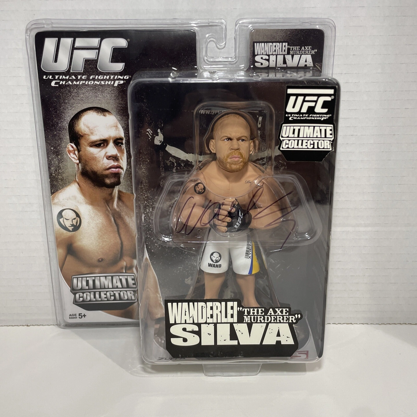 This is a Round 5 UFC action figure featuring Wanderlei Silva, also known as 'The Axe Murderer'. It's from the Pride Ultimate Collector series and includes an axe accessory. The figure was manufactured around 2010. It's a limited edition item.