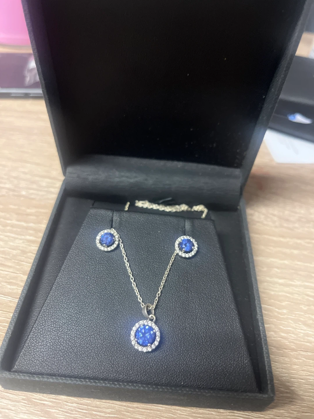 Beautiful blue gemstone necklace and matching stud earrings. Set includes original black jewellery box. Silver-tone chain and settings.