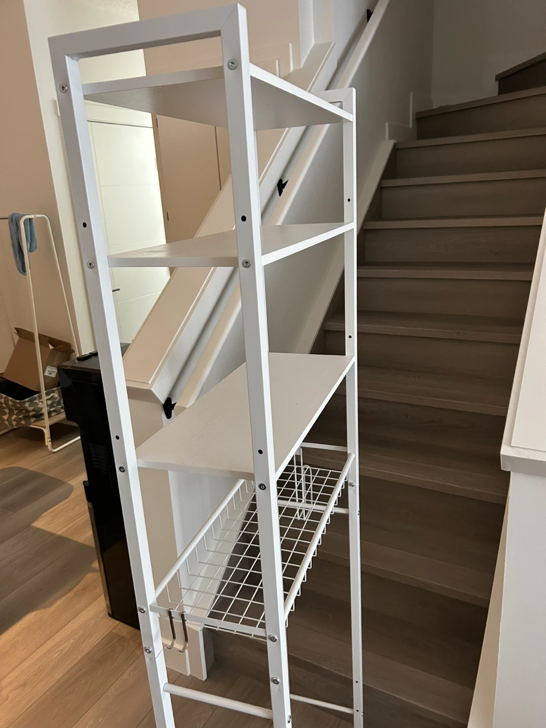 This four-tier metal shelf unit comes in white and includes a wire basket. It's designed for easy storage and organization. This shelving unit is great for bathrooms or tight spaces!