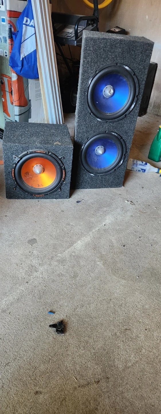 Two Cadence subwoofer speakers. One has an orange cone, the other has a blue cone. Both are in carpeted enclosures.