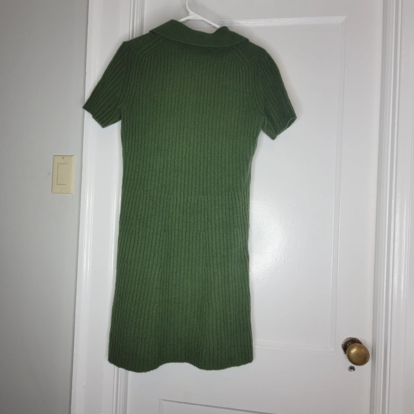 This BR green ribbed dress features a collared neckline and short sleeves. It's a size S/P. The dress is made of a knit material.