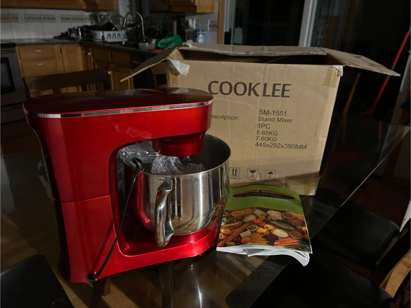 This is a COOKLEE SM-1551 stand mixer in red. It comes with the original box and a cookbook. Mixer is 5.65KG with dimensions of 445x292x390MM. It's great for baking needs!
