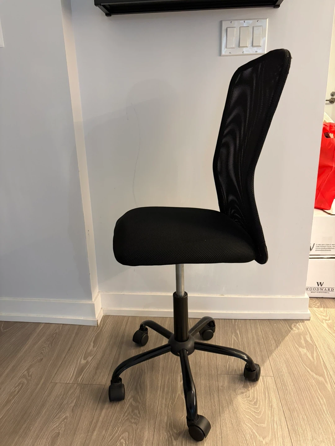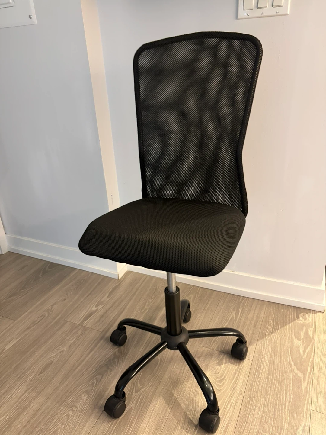 This is a black mesh office chair with a five-wheel base for stability. The mesh back provides breathability. Its swivel design allows for easy movement.
