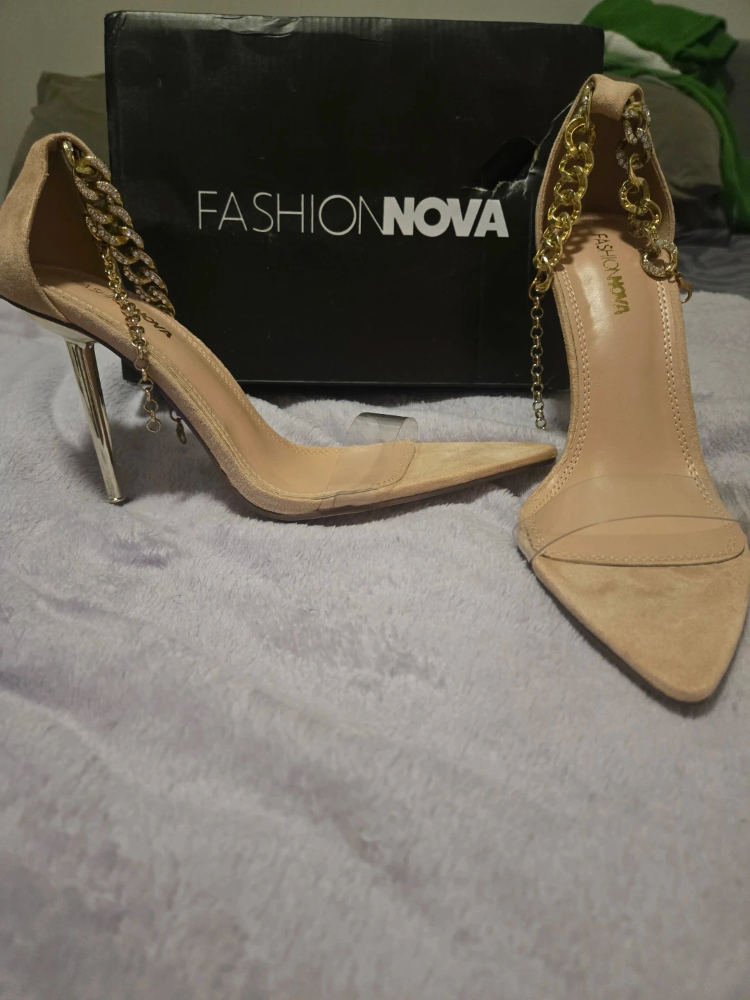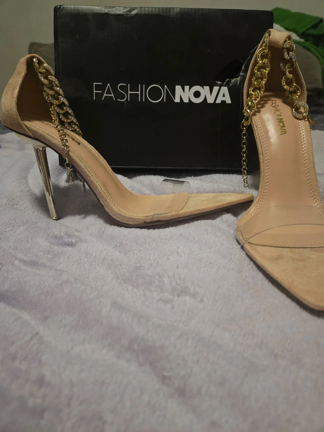 These Fashion Nova heels feature a stylish design with gold chain accents around the ankle strap. They have a pointed toe and clear vamp straps. Comes with original box.