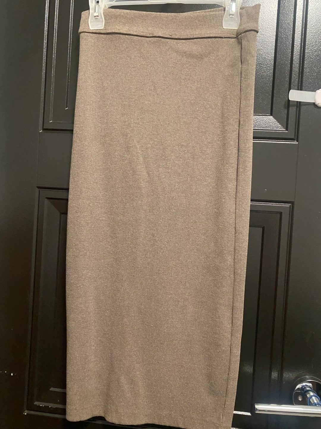 Selling a gently used S&S knit skirt in size L. It features a stylish zipper detail at the front and a comfortable, stretchy material. Perfect for adding a touch of casual elegance to your wardrobe!