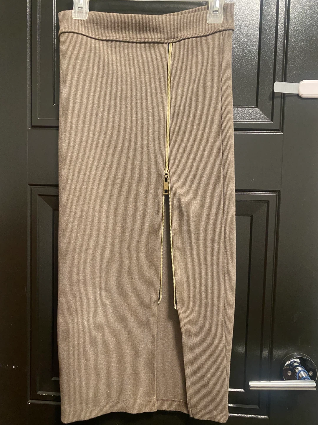 Selling a gently used S&S knit skirt in size L. It features a stylish zipper detail at the front and a comfortable, stretchy material. Perfect for adding a touch of casual elegance to your wardrobe!