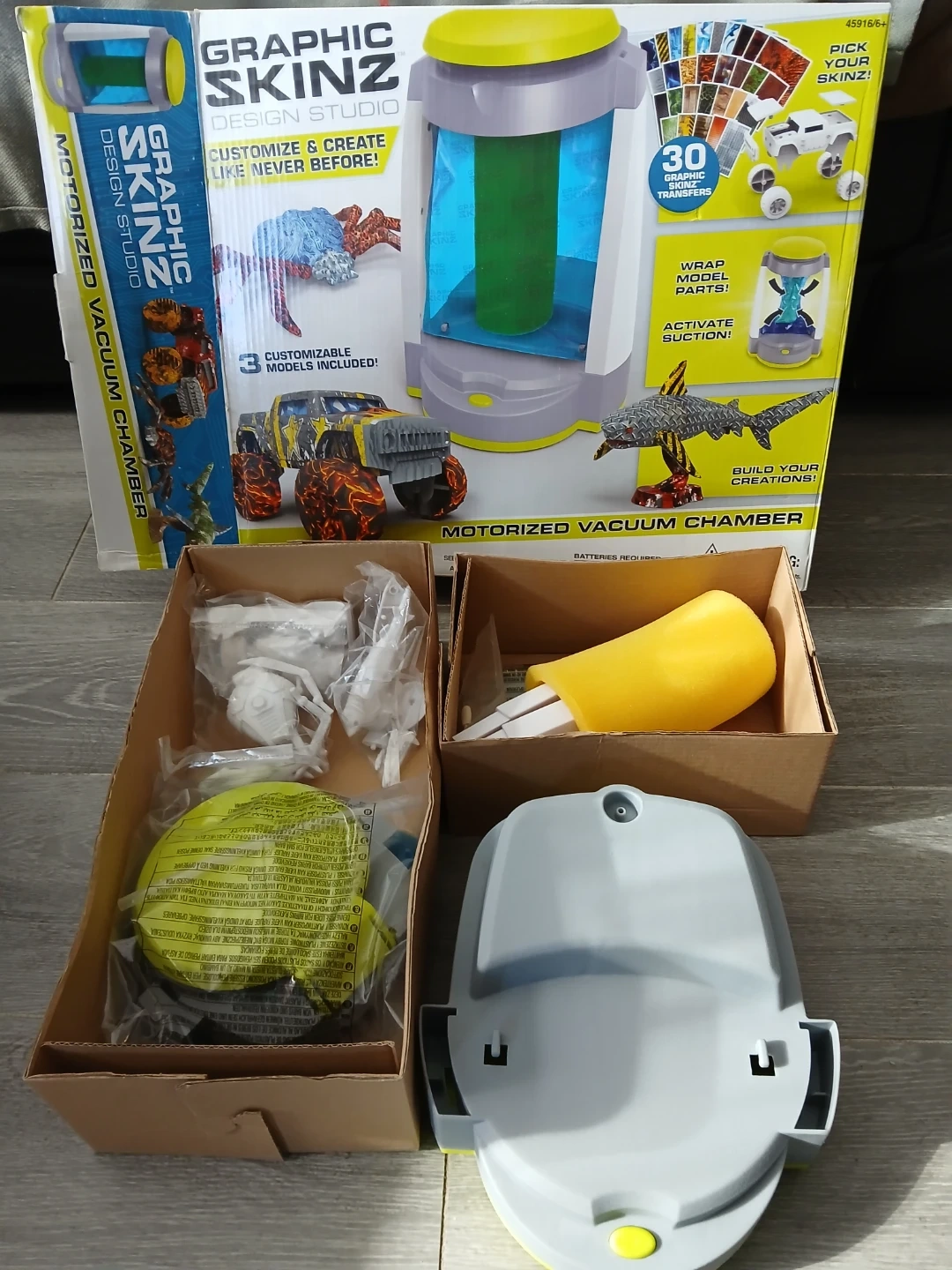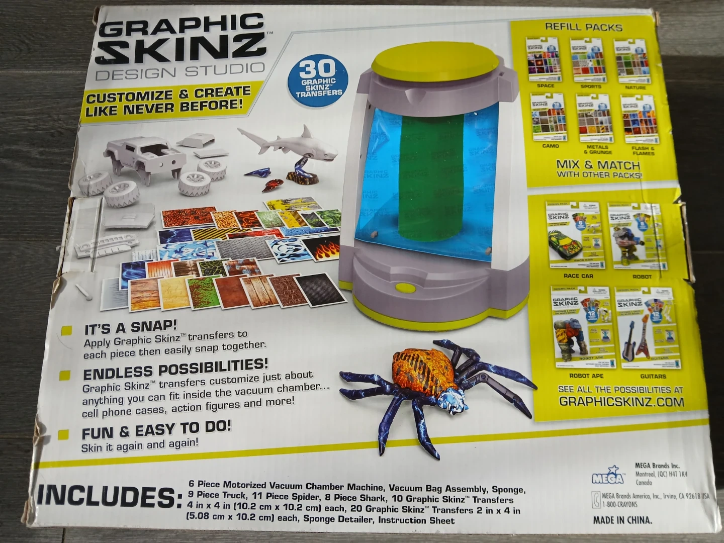 Customize and create like never before with the Graphic Skinz Design Studio Motorized Vacuum Chamber. It includes 30 graphic skinz transfers, a vacuum chamber machine, vacuum bag, sponge, and various customizable models. This kit is designed for fun and easy customization of models!