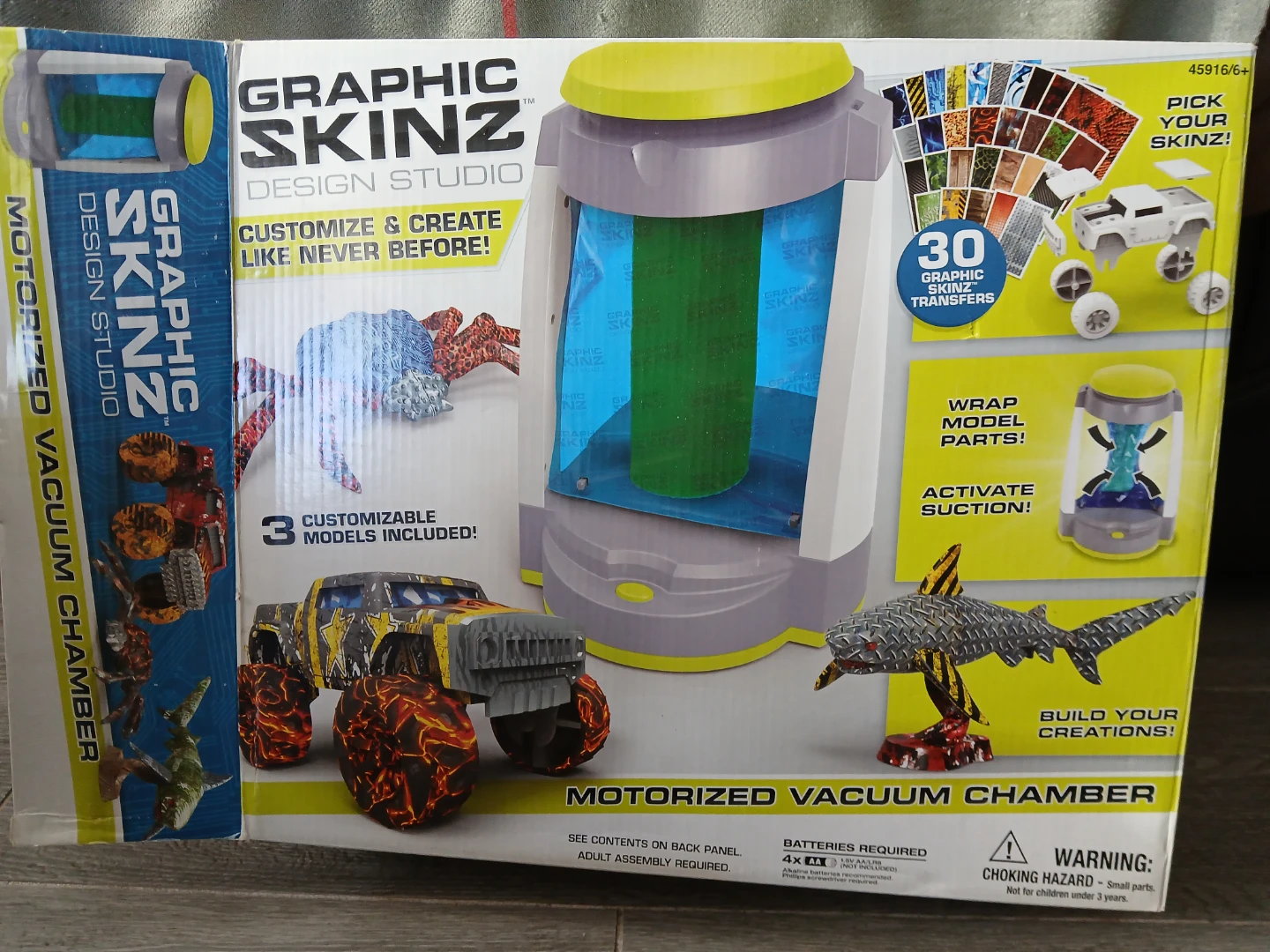 Customize and create like never before with the Graphic Skinz Design Studio Motorized Vacuum Chamber. It includes 30 graphic skinz transfers, a vacuum chamber machine, vacuum bag, sponge, and various customizable models. This kit is designed for fun and easy customization of models!
