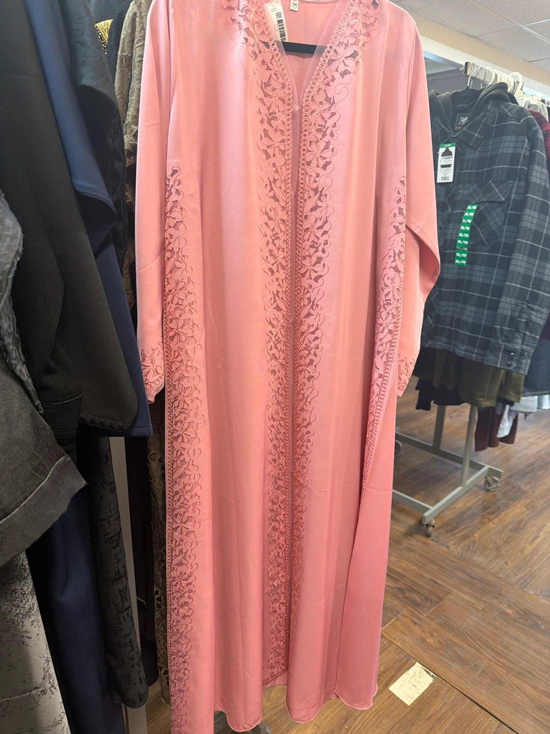 Pretty pink kaftan with intricate floral embroidery along the neckline and sleeves. It's a lovely piece for special occasions. The material looks lightweight and flowy.Size 54 made in UAE