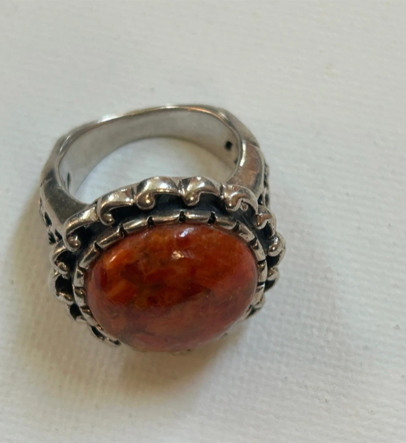 Sterling silver ring featuring a natural orange coral cabochon. The band is intricately detailed with openwork scroll designs. Stamped 925 Thailand.
