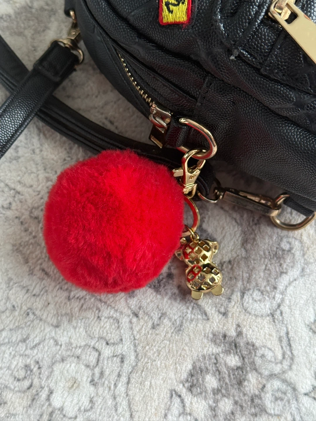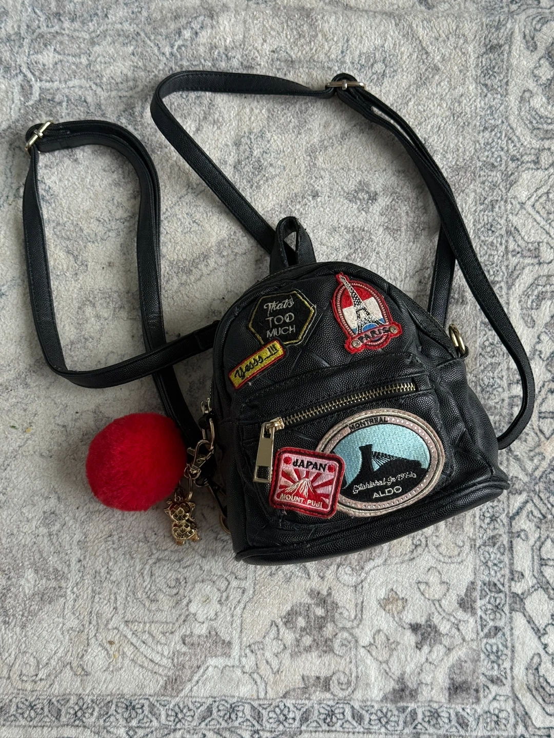 Cute black mini backpack from ALDO. It features various travel-themed patches, including Japan, Paris, and Montreal. Comes with a detachable red pom pom charm and a small bear charm. Faux leather material with gold hardware.