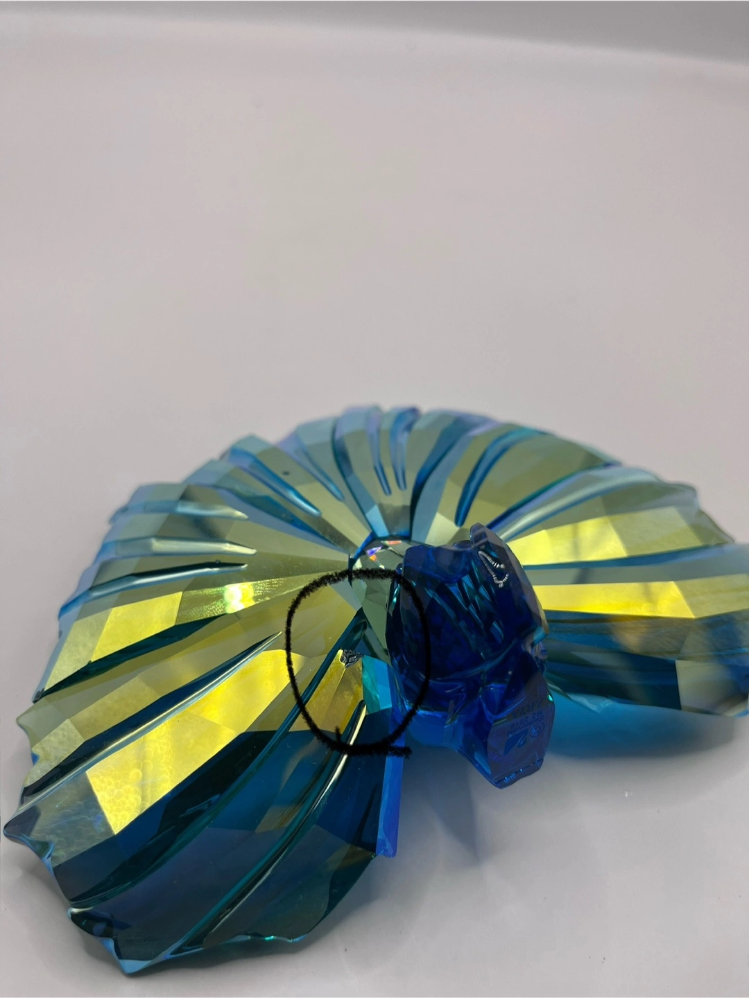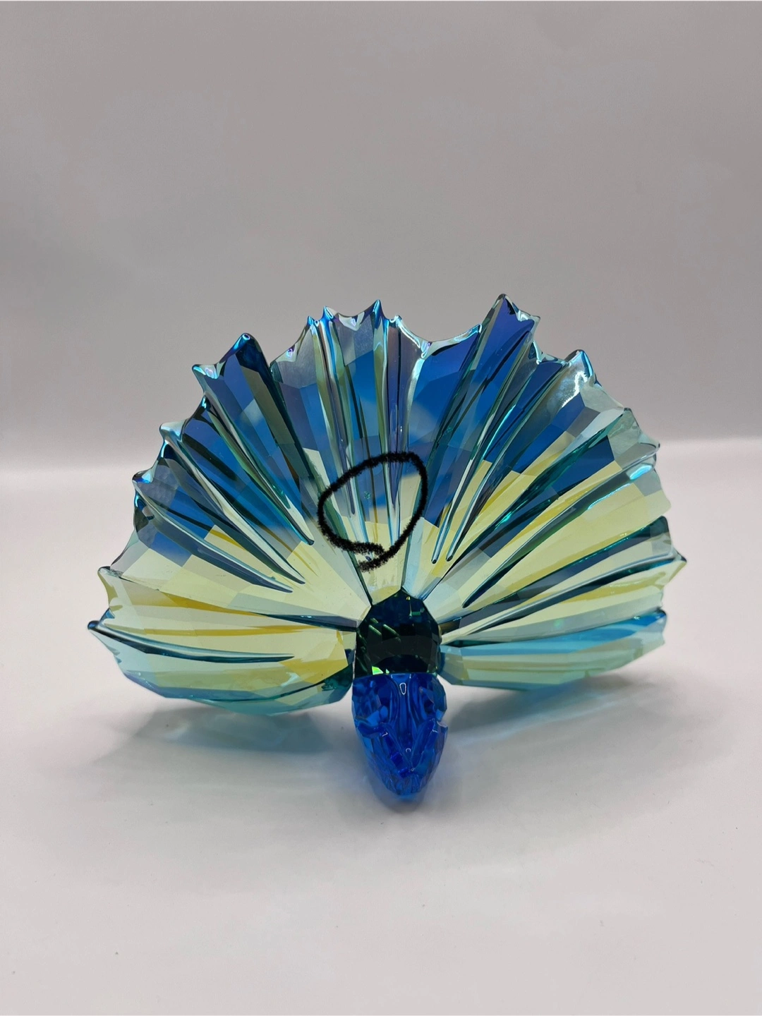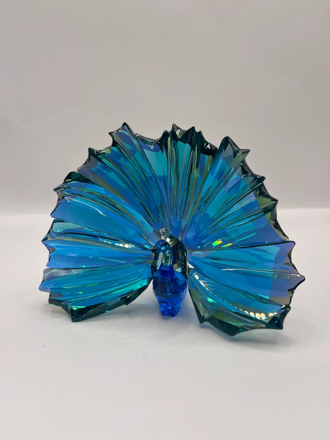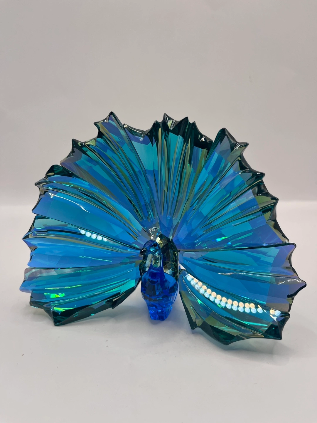 106Beautiful Swarovski crystal peacock figurine. This piece features stunning blue and clear crystal facets that catch the light beautifully. There is a minor scratch as shown in the first photo.