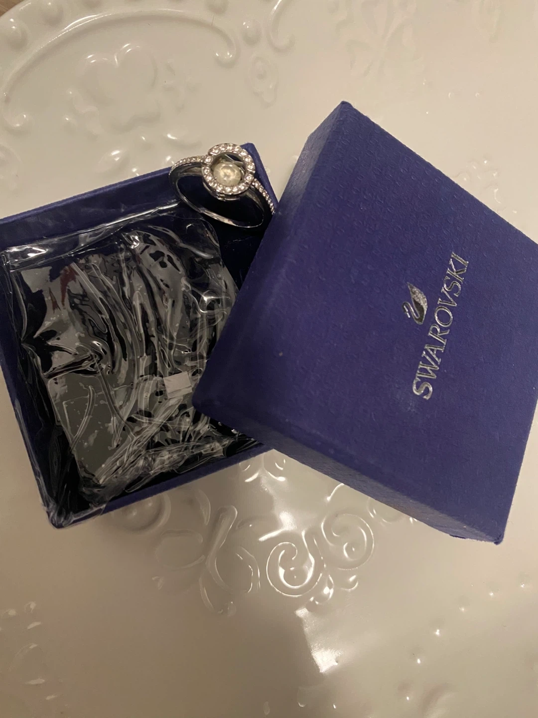 132This is a Swarovski ring with crystals and rhodium plating. This ring is previously owned. I would estimate the size is 9. Note : Two crystals are missing and the ring bottom color is tarnished. If the ad is up, it's available! Cash only