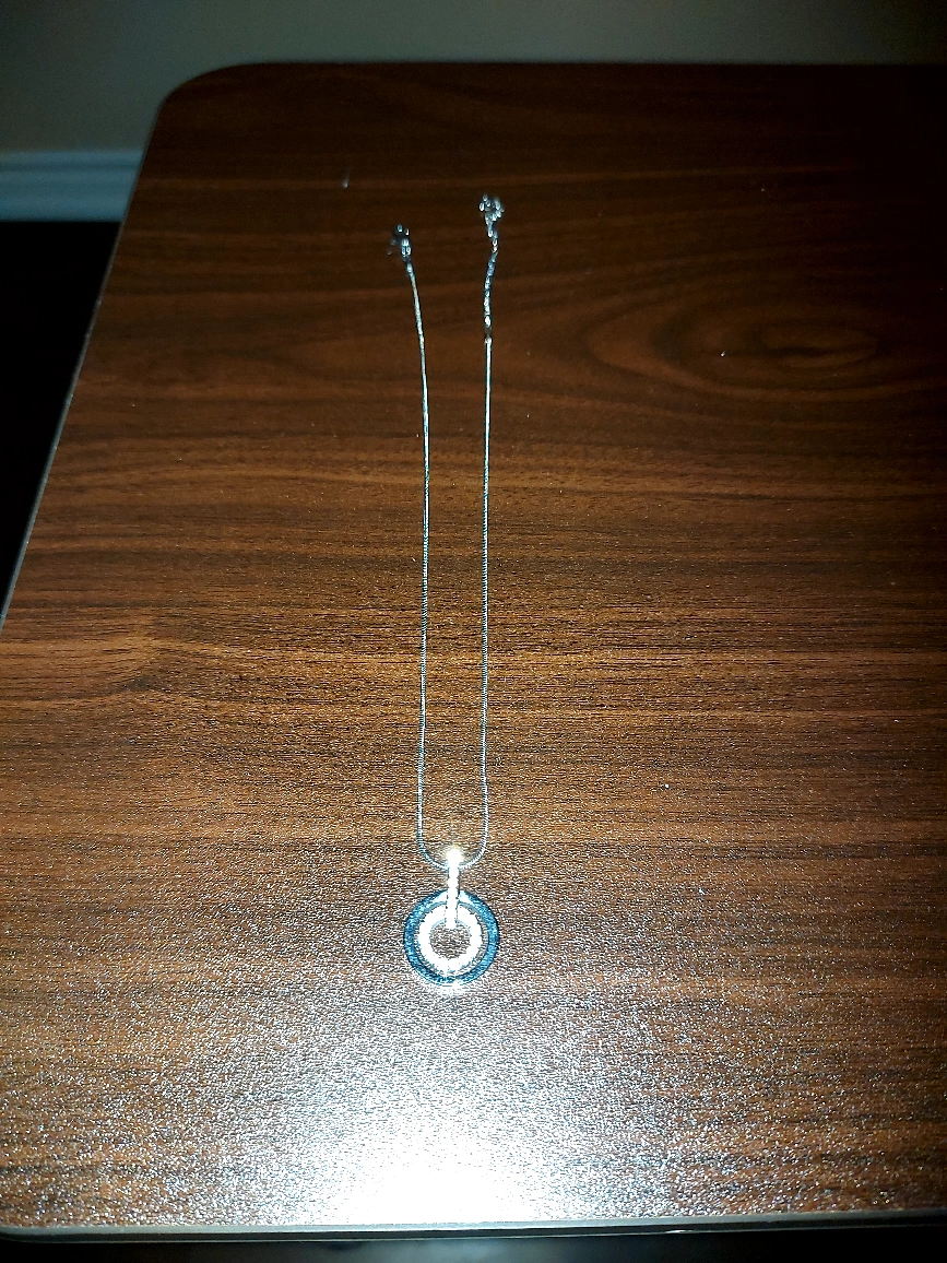 Silver necklace with a circle pendant. The pendant is made of three interlocking circles, with the outer circle being a single band of tiny stones.