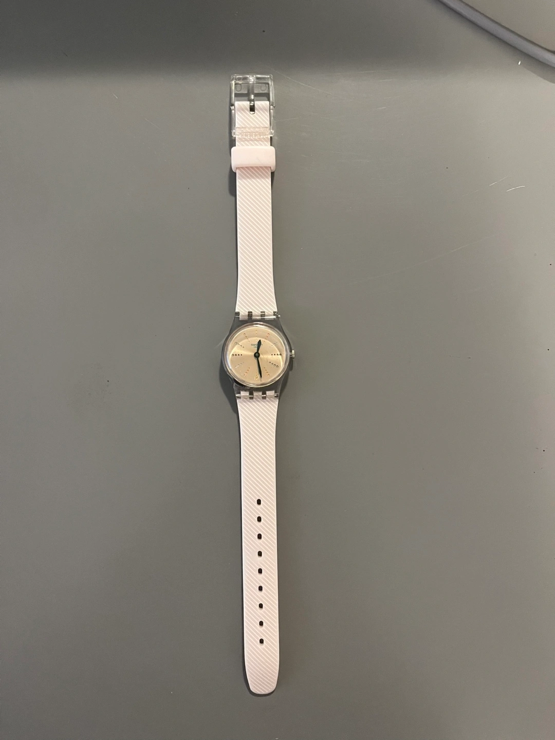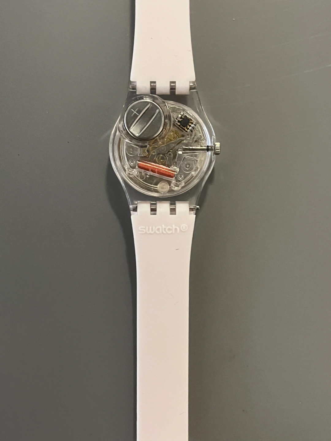 Selling a stylish Swatch quartz watch in white! It's in great condition and ready to add a touch of fun to your wrist. This watch features a unique transparent back, letting you see the inner workings. A cool and trendy accessory! And it’s also waterproof! price is negotiable!