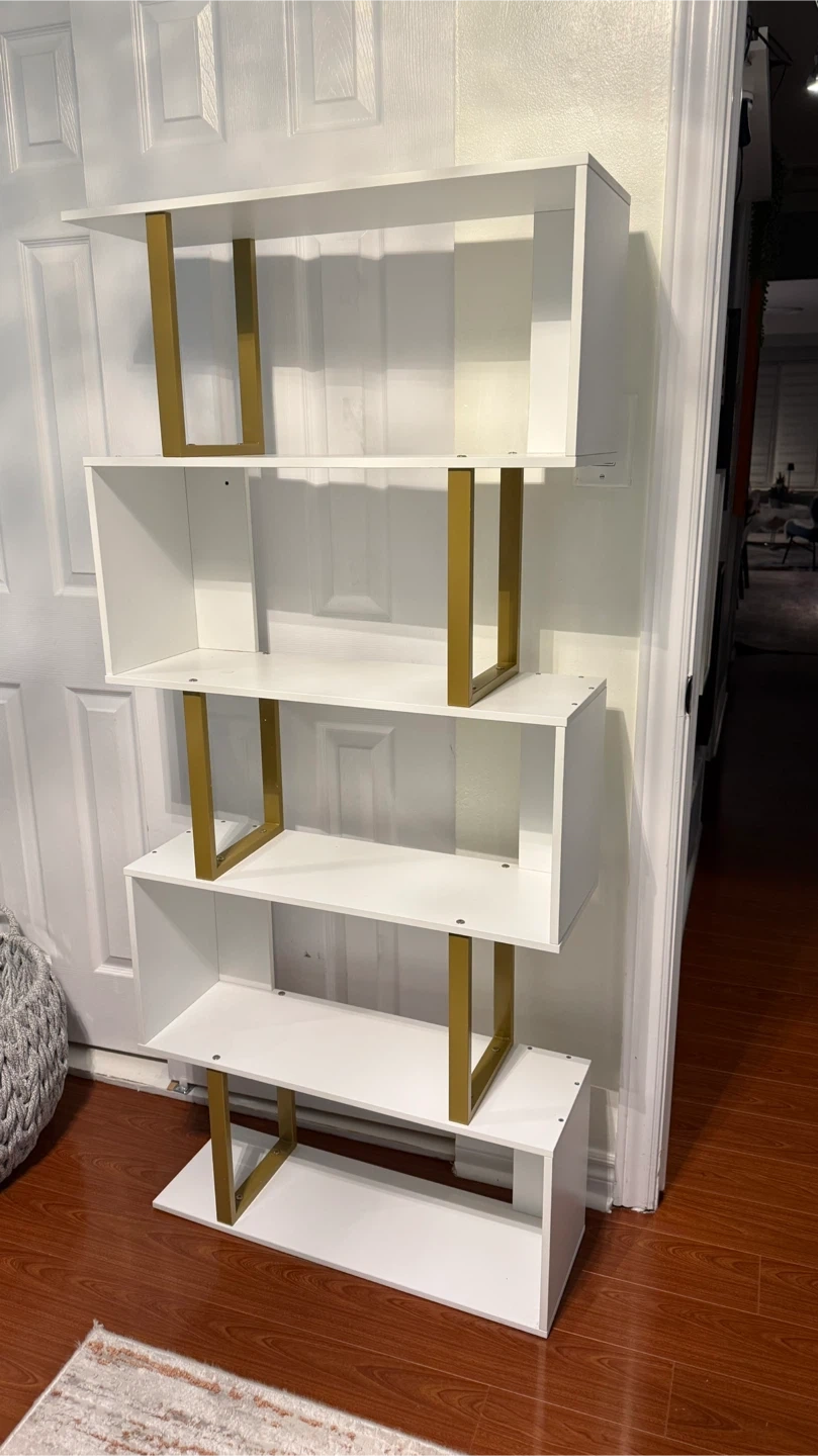 Stylish white bookshelf with gold metal accents. It has four shelves in a staggered design. Perfect for displaying books and decor items.