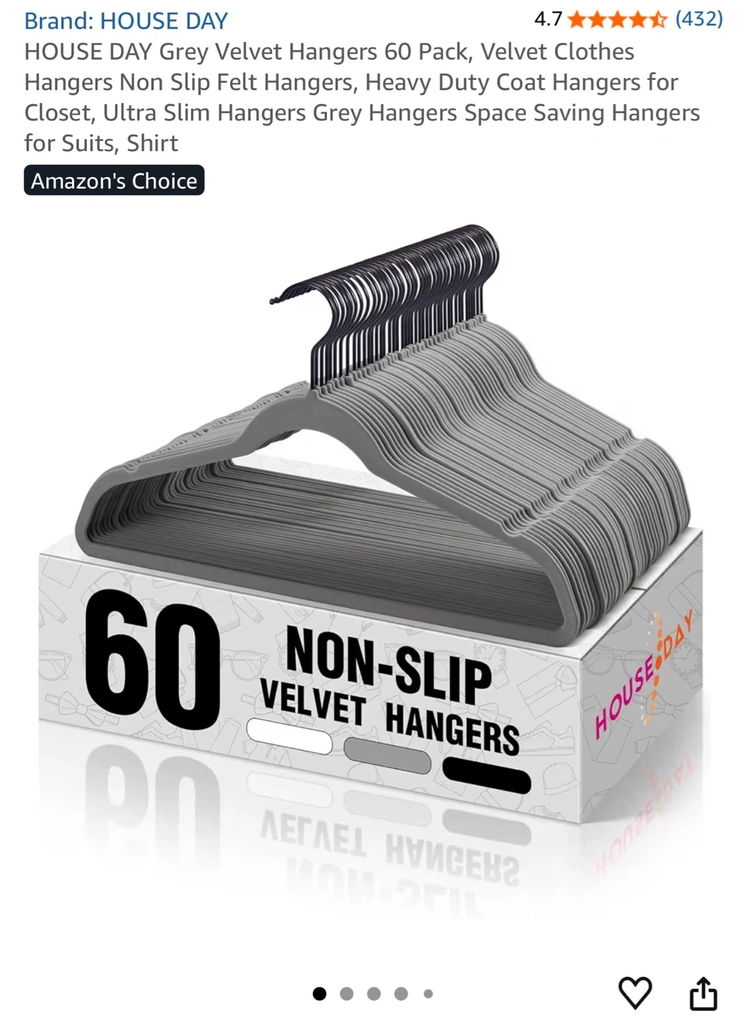 HOUSE DAY grey velvet non-slip hangers, 60 pack. These hangers are made with velvet material and a non-slip design. They're great for coats, suits, and shirts.