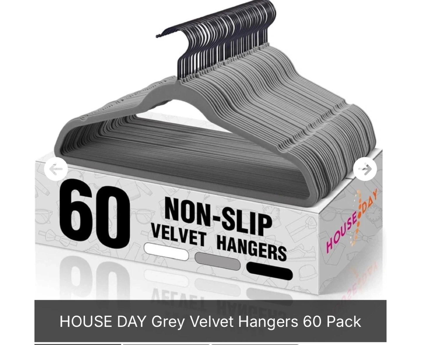 HOUSE DAY grey velvet non-slip hangers, 60 pack. These hangers are made with velvet material and a non-slip design. They're great for coats, suits, and shirts.