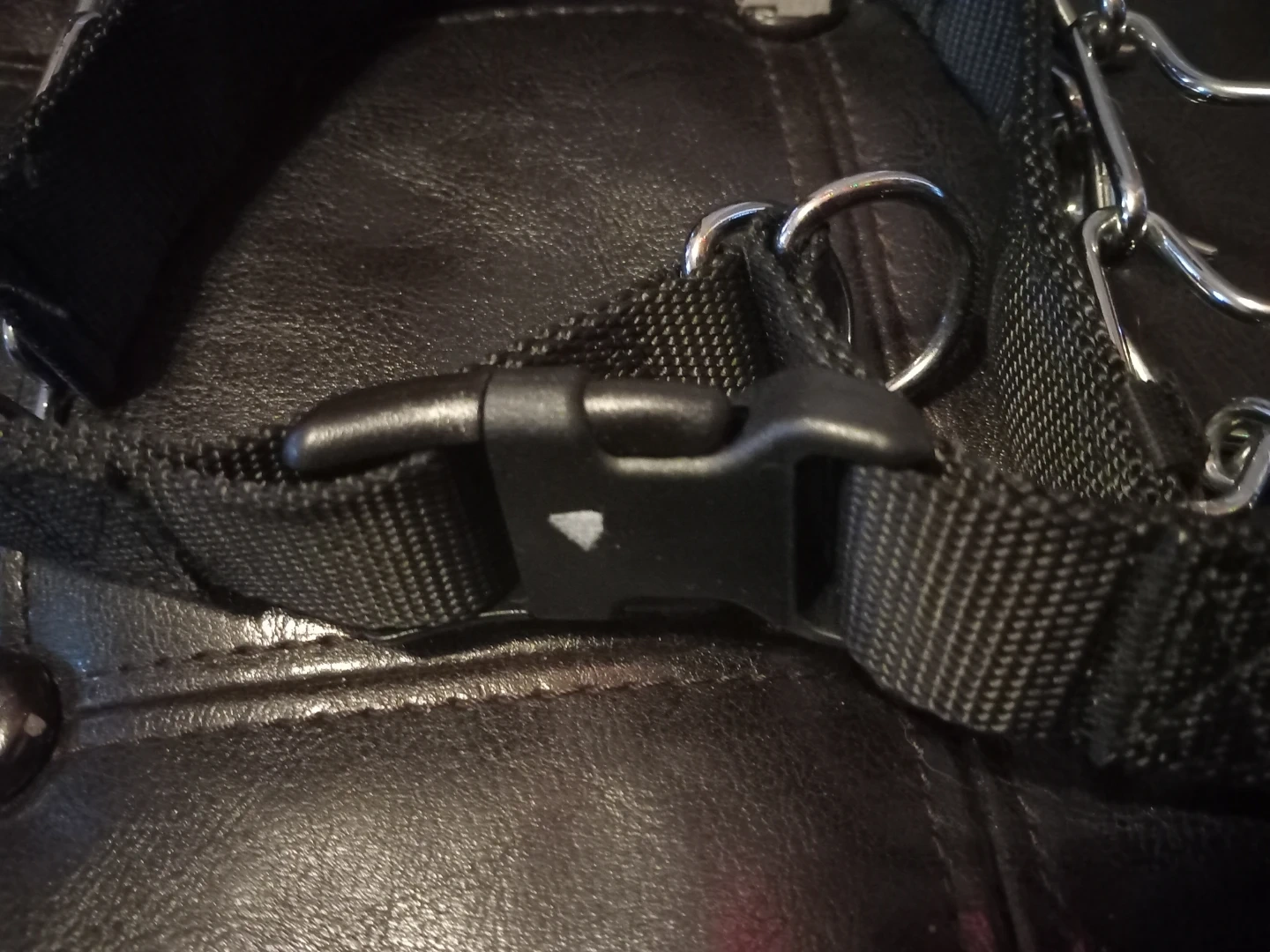 This black nylon training collar features a prong design with a quick-release buckle. It's made with durable nylon webbing and metal prongs. This collar is designed for dog training purposes.