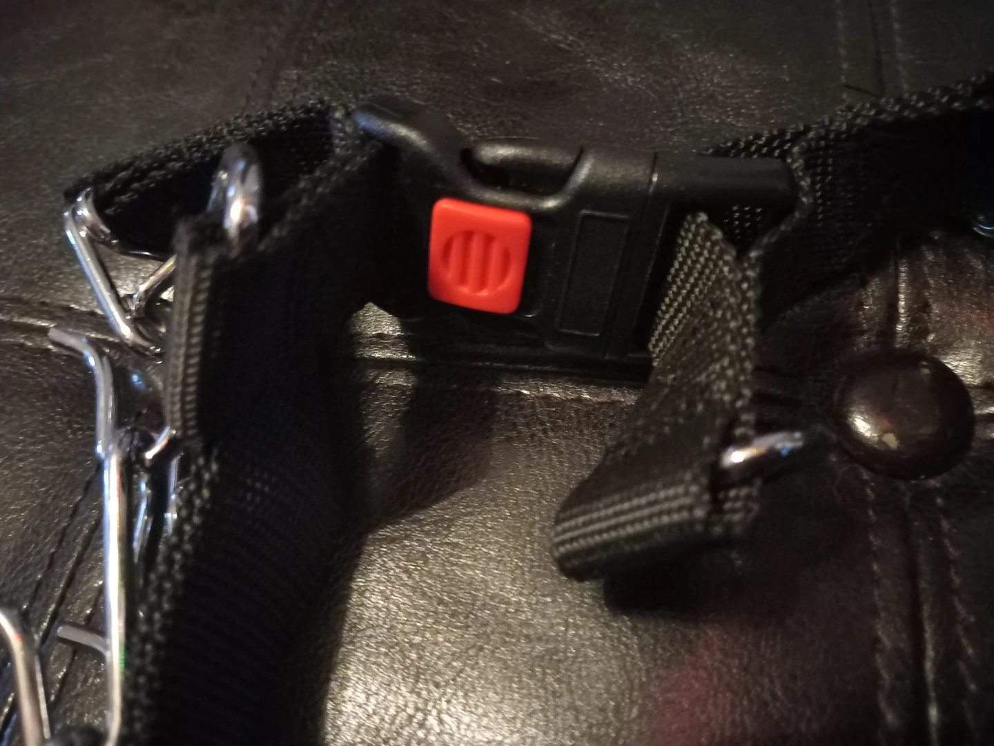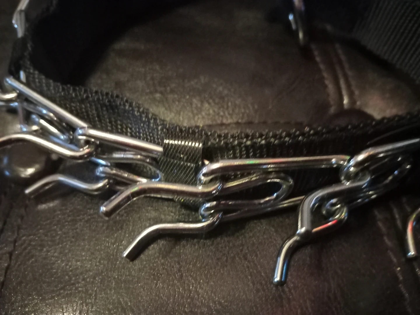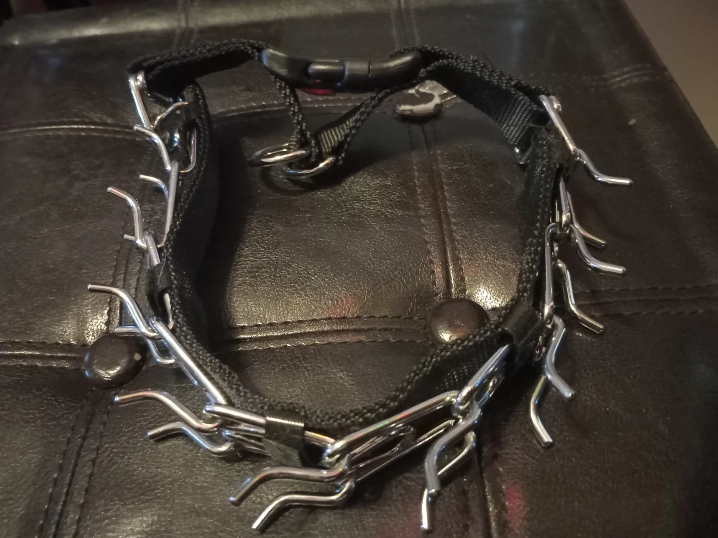 This black nylon training collar features a prong design with a quick-release buckle. It's made with durable nylon webbing and metal prongs. This collar is designed for dog training purposes.