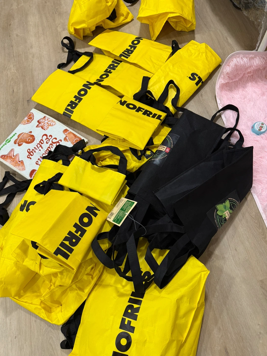 A collection of No Frills reusable shopping bags, perfect for groceries or errands! There are both yellow and black bags available. They're in great shape and ready to help you carry your goods