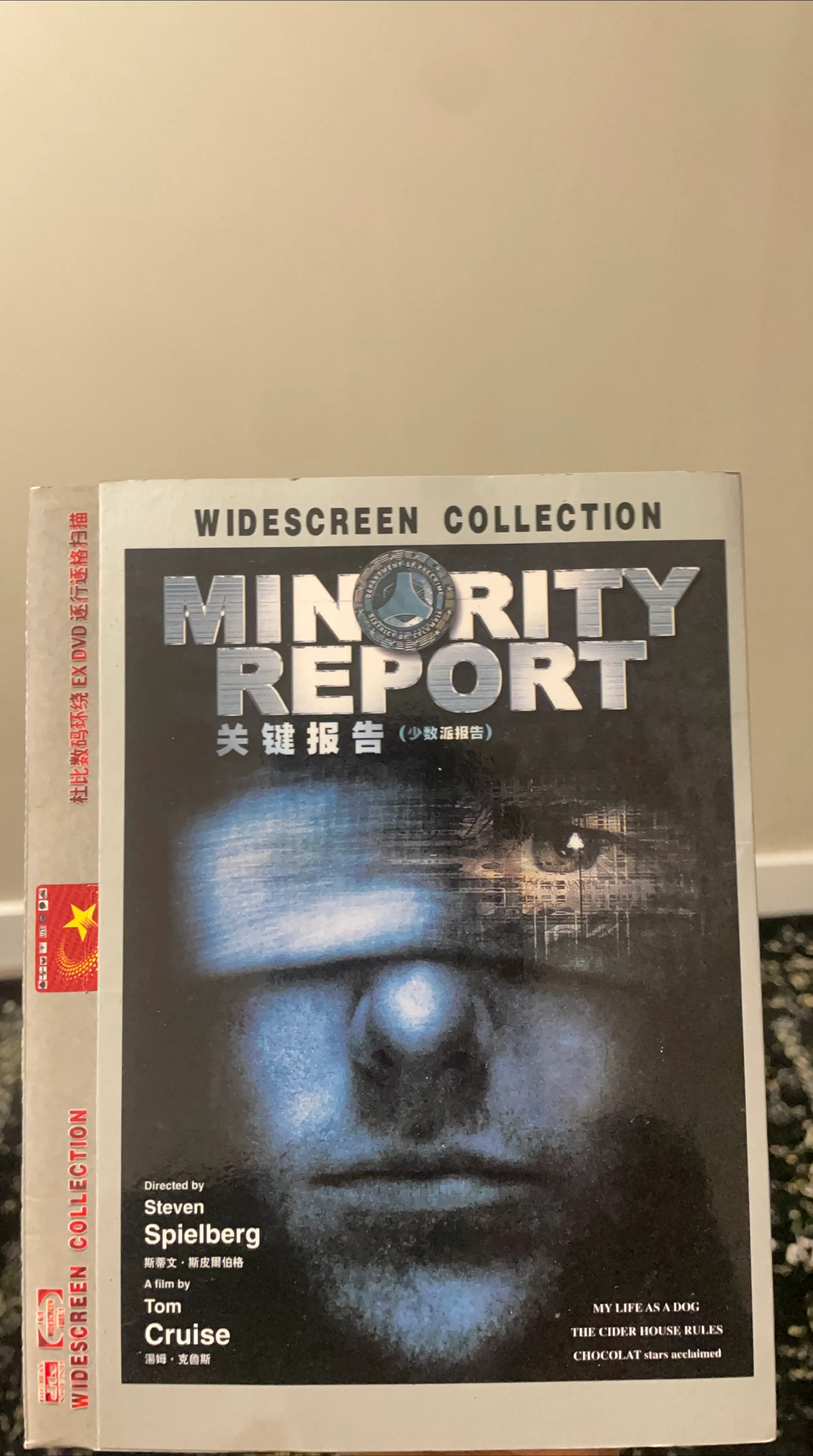 Selling a widescreen collection DVD of Minority Report, directed by Steven Spielberg and starring Tom Cruise! It also includes the films My Life as a Dog, The Cider House Rules, and Chocolat