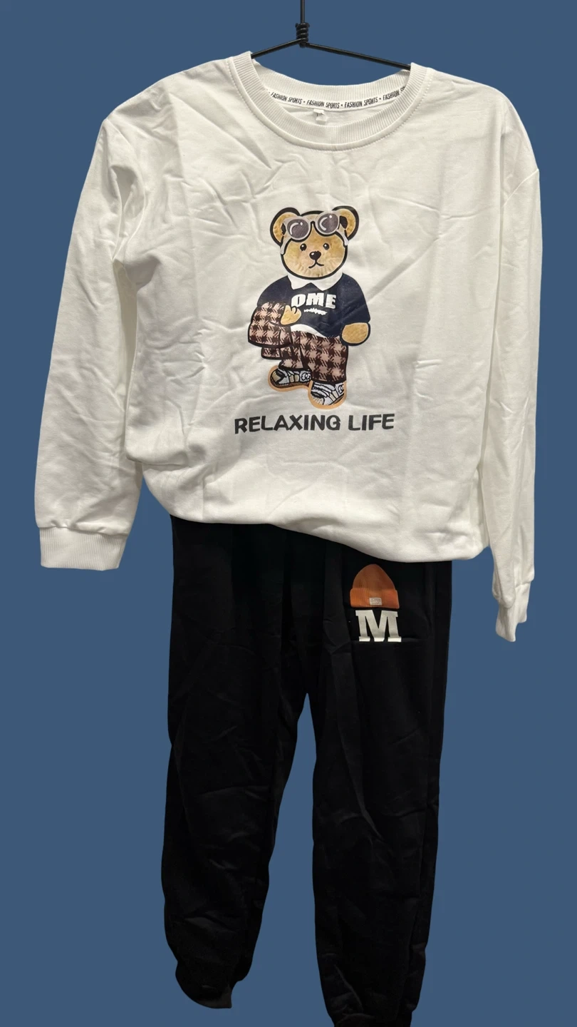 41Cozy sweatshirt and pants set, perfect for relaxing at home! The sweatshirt is white with a cute bear design, and the pants are black with a simple logo. Great for lounging around the house or casual wear