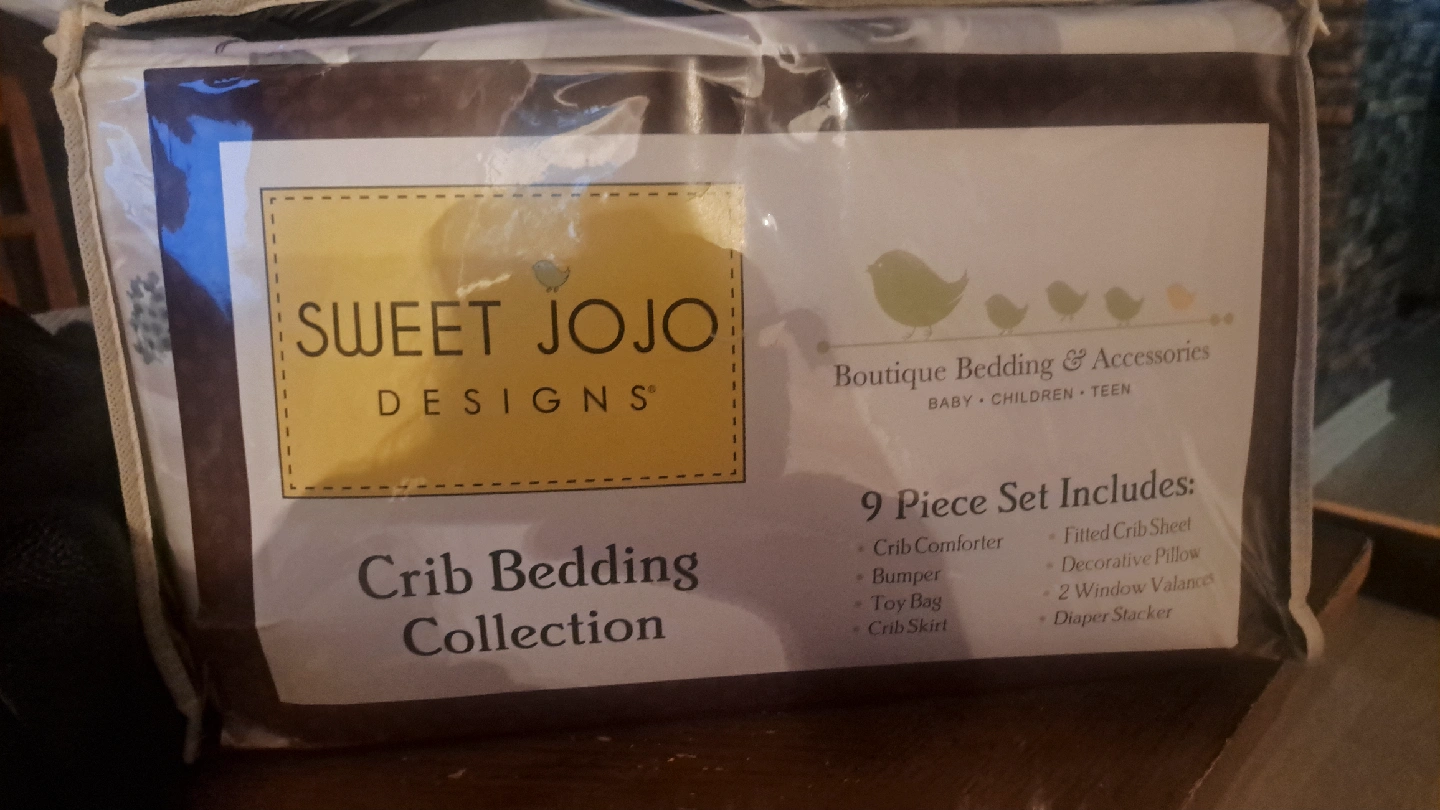 10Selling a Sweet Jojo Designs 9-piece crib bedding set! It includes a crib comforter, bumper, toy bag, crib skirt, fitted crib sheet, decorative pillow, 2 window valances, and a diaper stacker