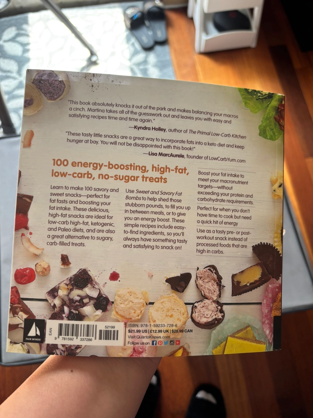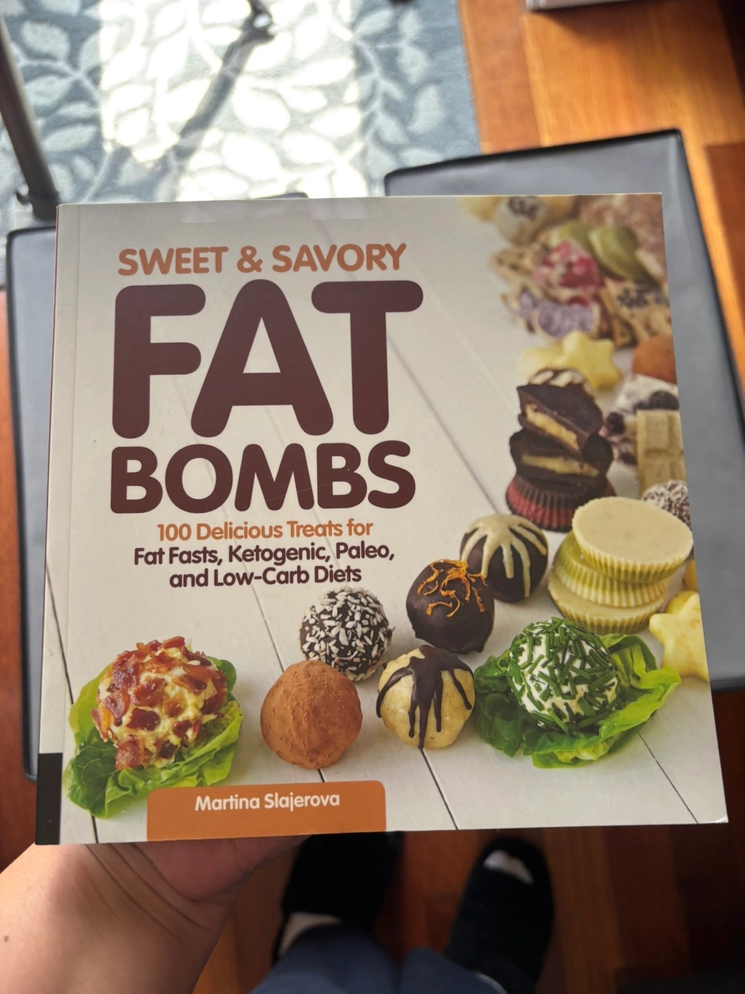 28Selling a copy of "Sweet & Savory Fat Bombs: 100 Delicious Treats for Fat Fasts, Ketogenic, Paleo, and Low-Carb Diets" by Martina Slajerova. This cookbook is perfect for anyone looking for energy-boosting, high-fat, low-carb, and no-sugar treats. Learn to make 100 savory and sweet snacks to boost your fat intake. It is a great alternative to sugary, carb-filled treats!