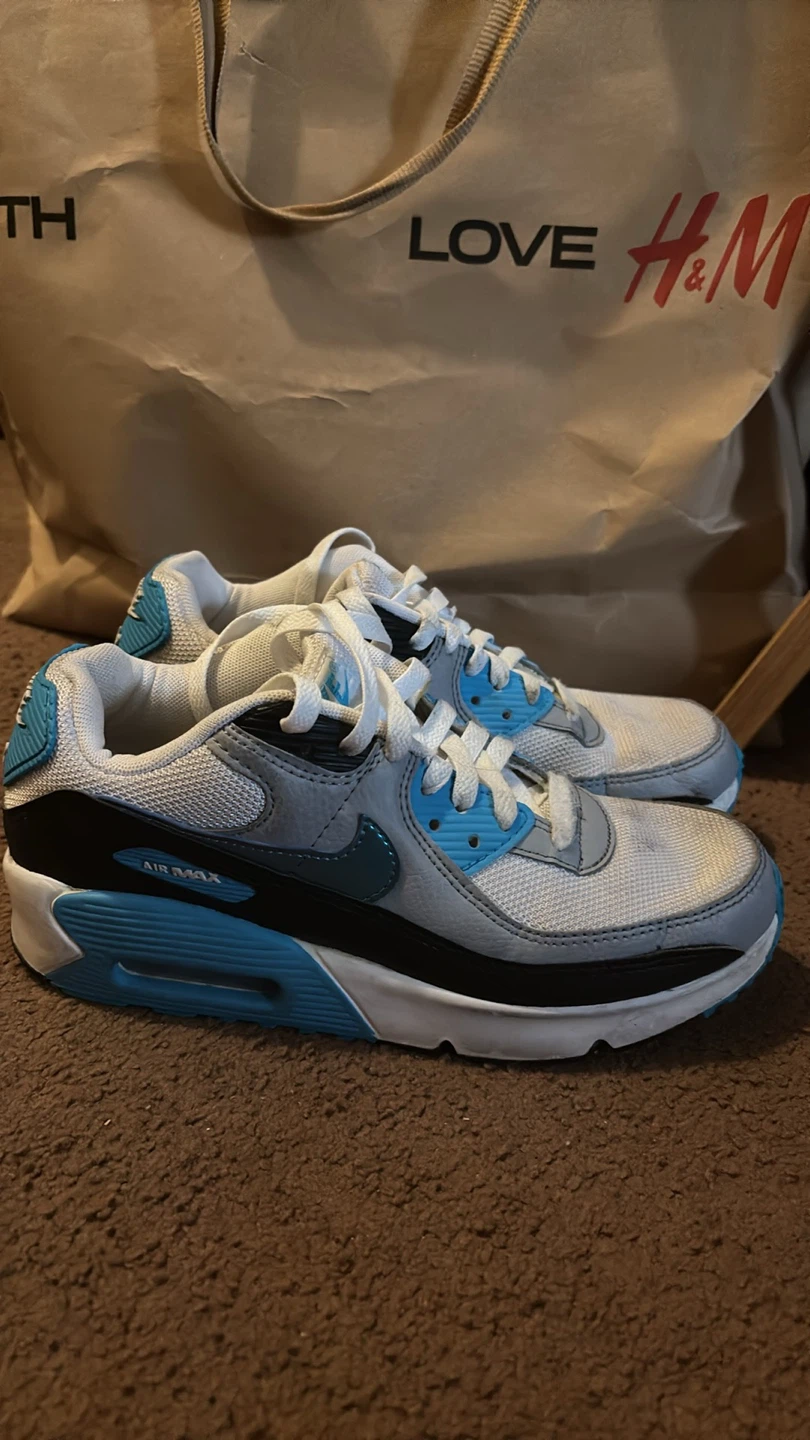 Selling a pair of kids Nike Air Max 90 sneakers. Size 5.5. They feature a stylish combination of blue, white, and black accents. Perfect for casual wear or workouts!