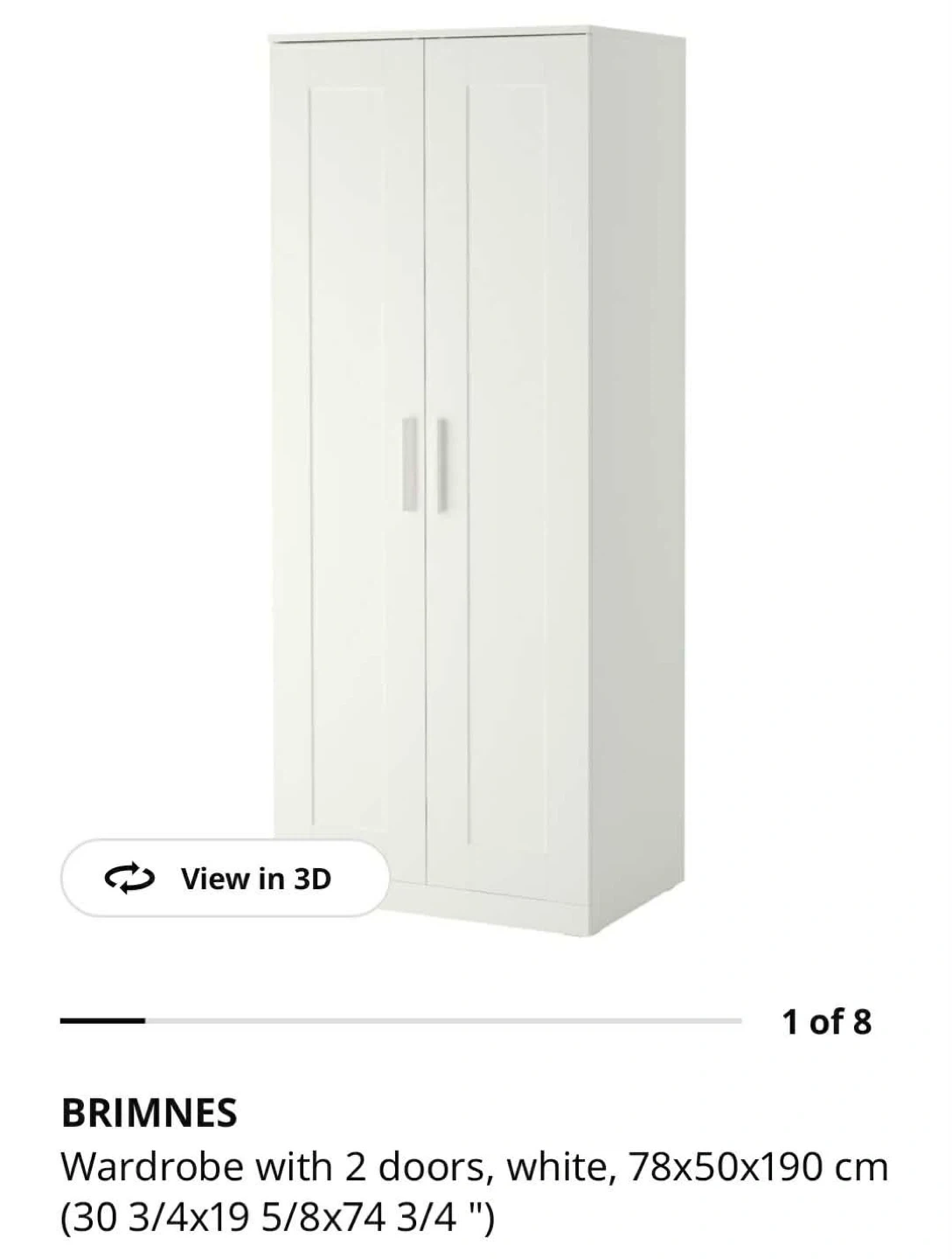 IKEA BRIMNES wardrobe. It's white and comes with two doors. Dimensions are 78x50x190 cm (30 3/4x19 5/8x74 3/4 "). It has hanging space and shelves.