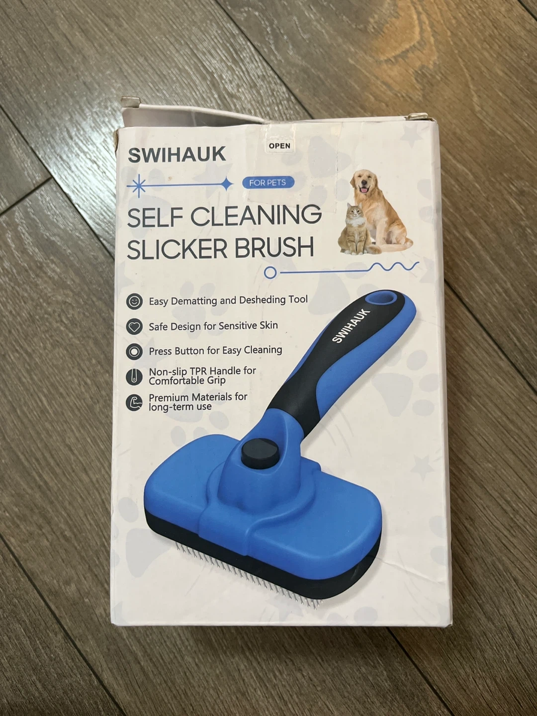 Selling a Swihauk self-cleaning slicker brush for pets! It's designed to easily remove mats and deshed your furry friends. The brush has a safe design for sensitive skin and a non-slip TPR handle for a comfortable grip. It also features a press button for easy cleaning and is made with premium materials for long-term use