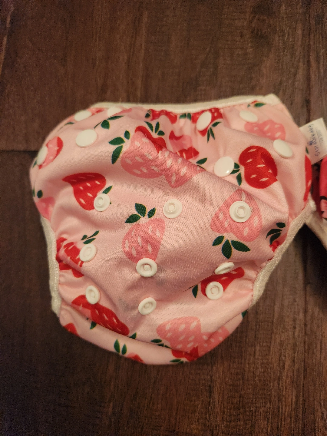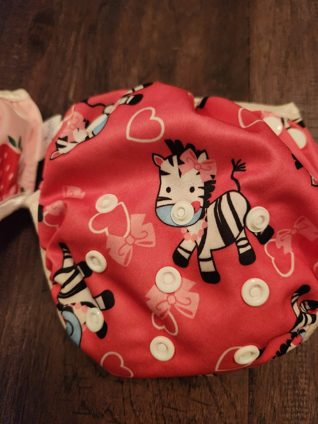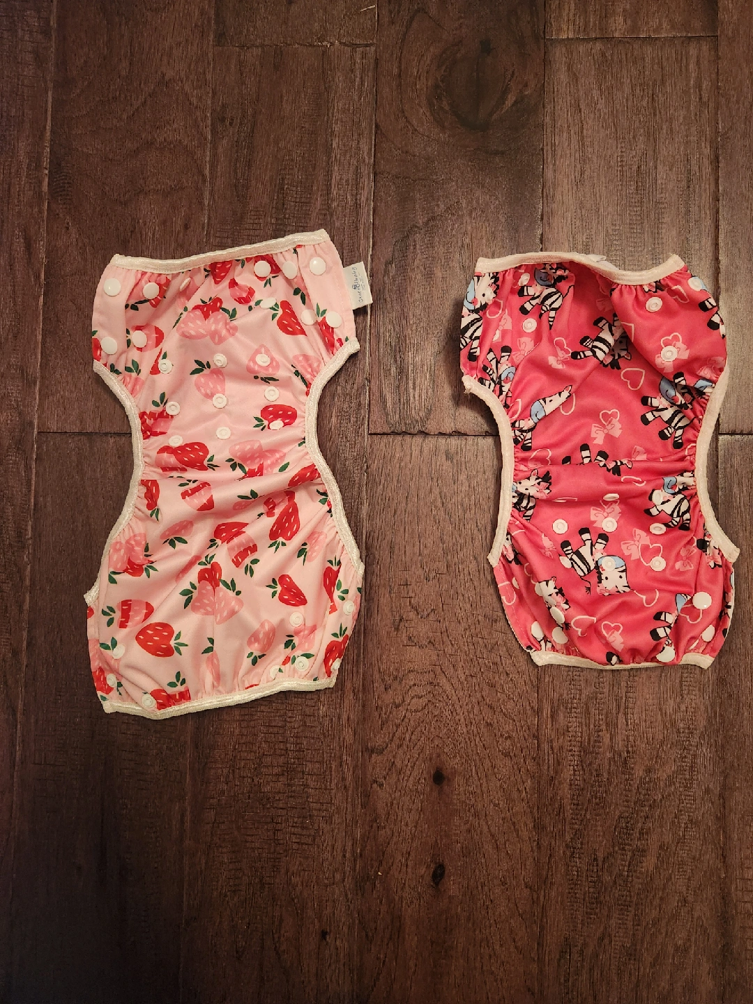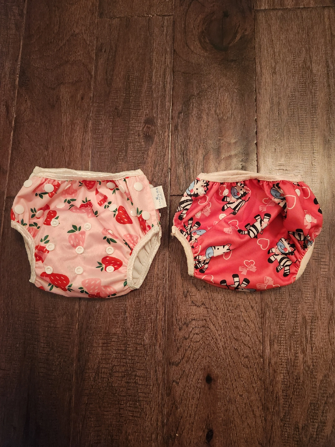 Two cute swimming diaper covers! One has a strawberry print and the other has a zebra print. Great for little ones!Perfect for swimming classes or going on vacation! Perfect covers for kids who are wearing dippers when you go to the water!