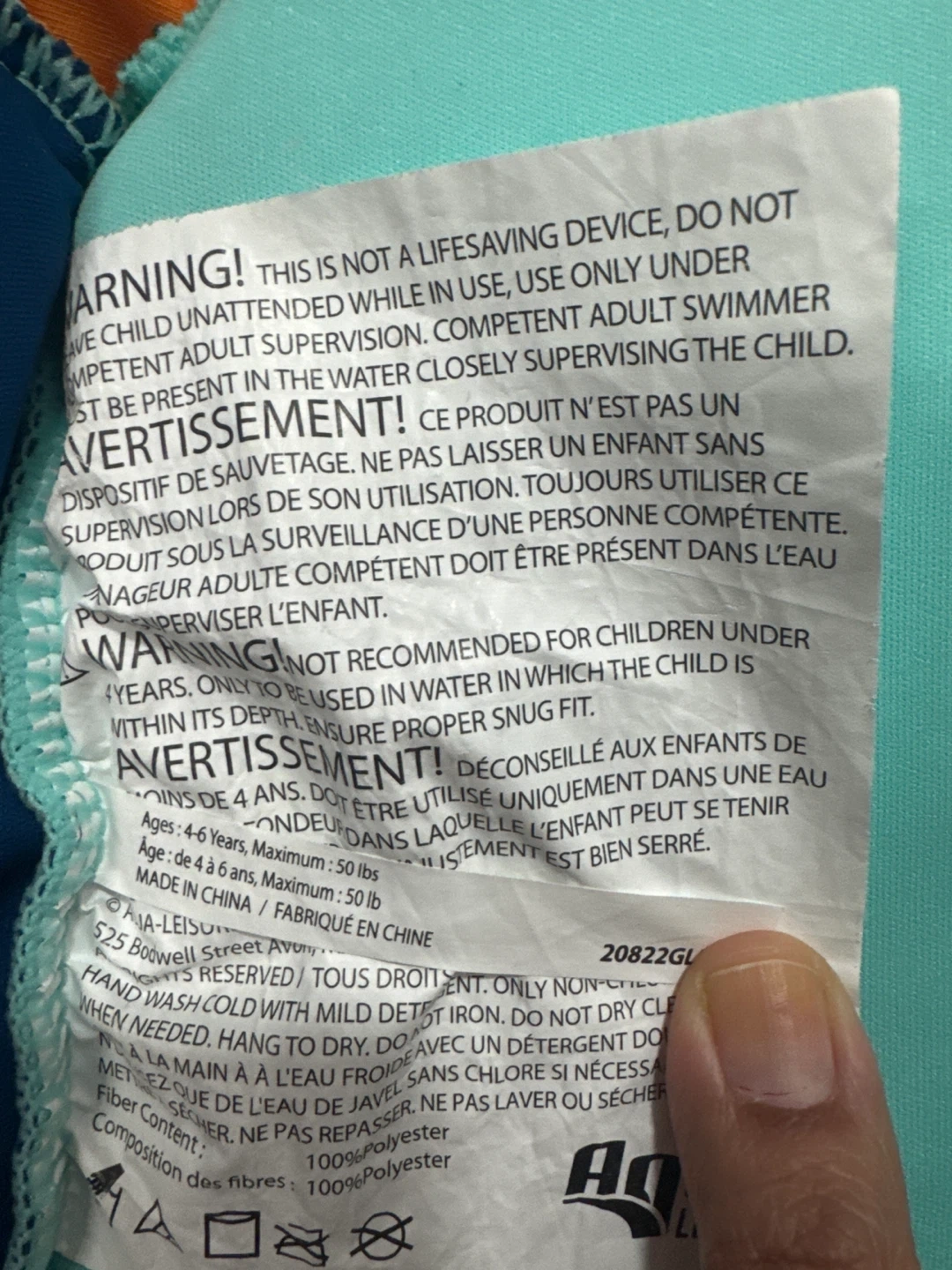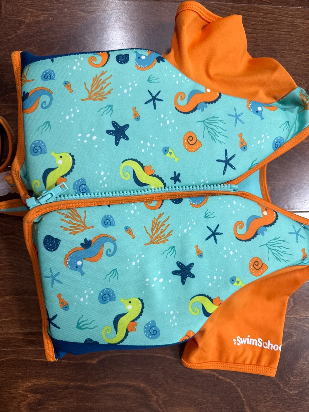 89This SwimSchool Learn-to-Swim Vest is perfect for kids aged 4-6 years, with a maximum weight of 50 lbs. It's designed to help children learn to swim safely and comfortably. The vest features a fun, colourful design with sea creatures. Made from 100% polyester