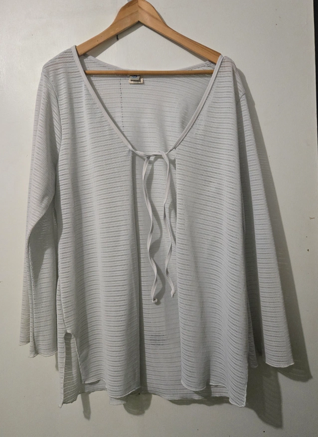 Selling a cute white mesh cover-up top in excellent condition! It features long sleeves and a tie at the front. Perfect for wearing over a swimsuit or tank top at the beach, the pool or on vacation! One Size but I'd say it fits Lg to 2X.